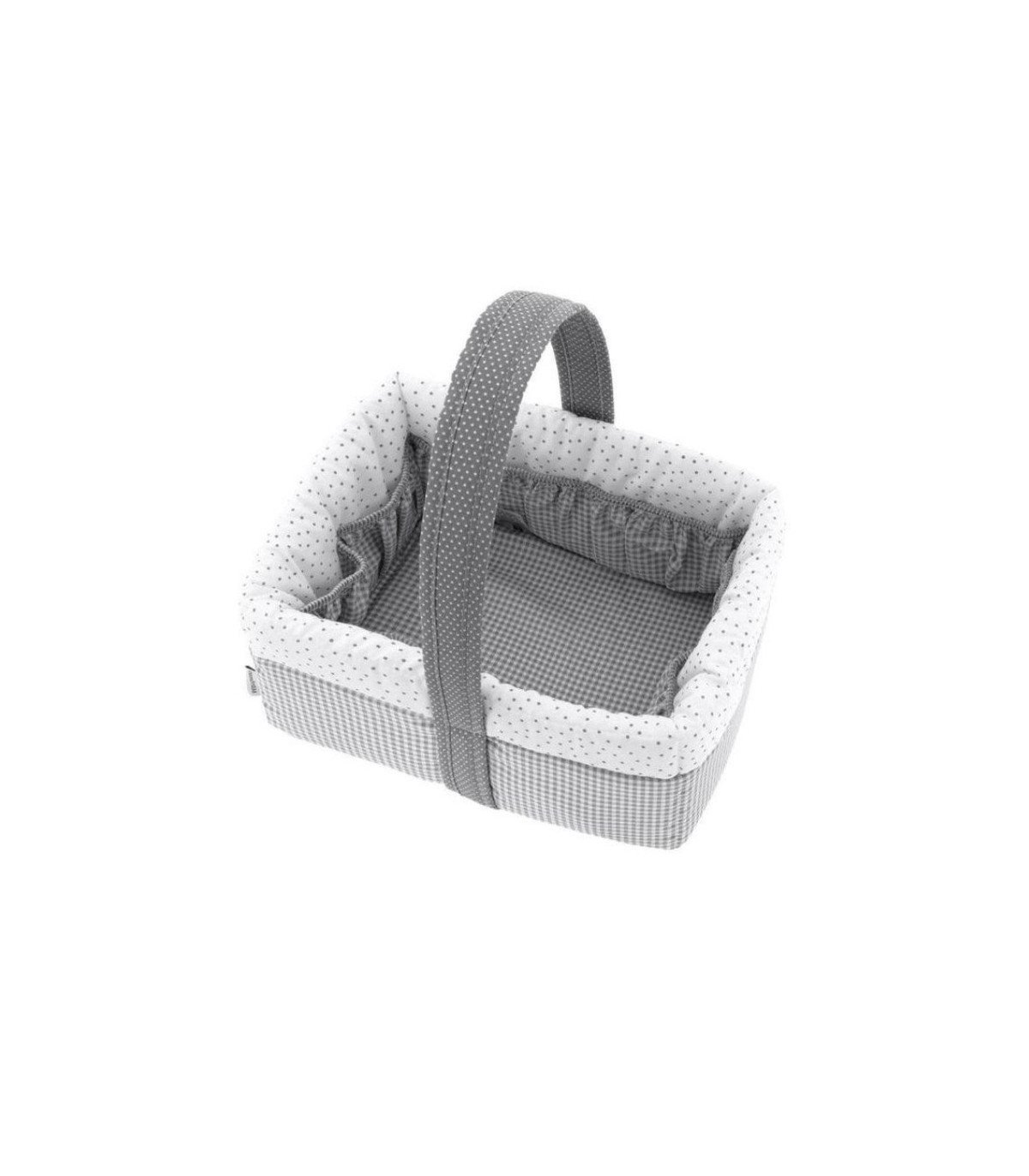 Canastilla para bebé en color gris, con productos básicos de higiene y cuidado. Ideal como detalle de bienvenida, regalo o preparación para el nacimiento.