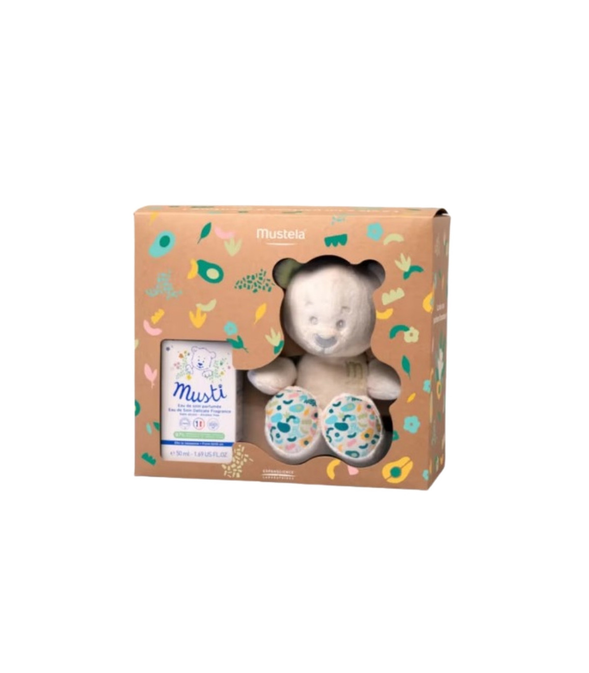 Pack regalo que incluye Eau de Soin Musti 50 ml —formulado con un 97 % de ingredientes de origen natural— y un tierno peluche Musti en suaves tonos pastel, todo presentado en un estuche eco-responsable con impacto ambiental reducido.