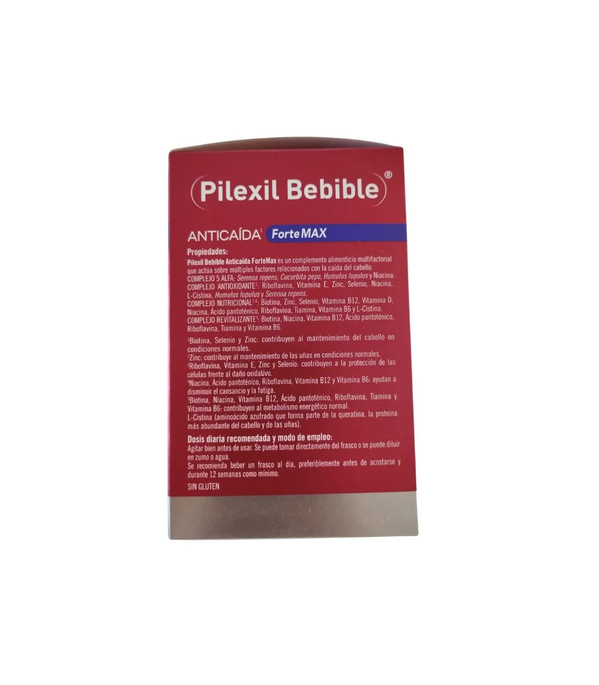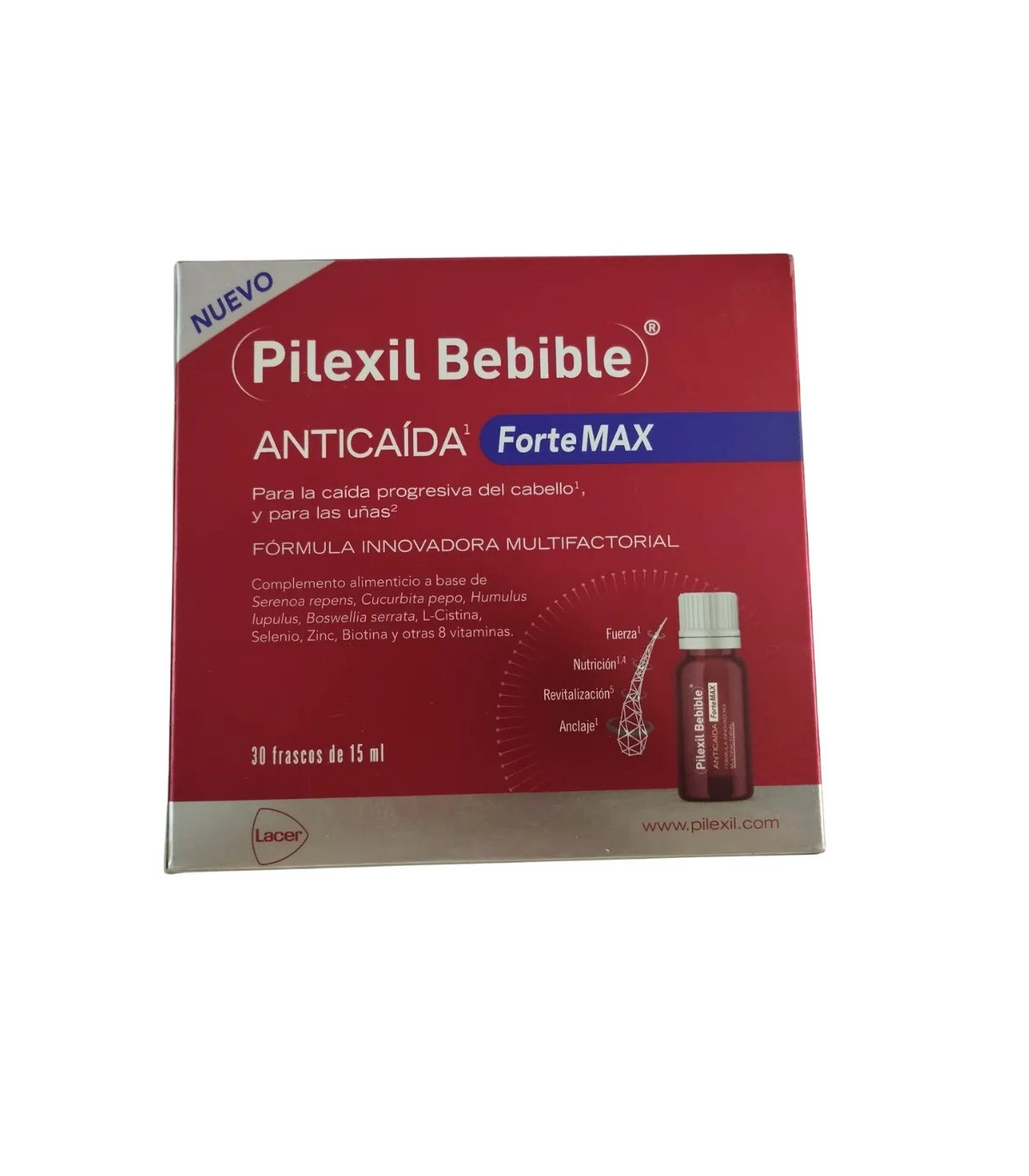 Pilexil Bebible Anticaída Forte MAX es un complemento alimenticio en formato bebible diseñado para combatir la caída progresiva del cabello y fortalecer las uñas. Su fórmula innovadora multifactorial combina Serenoa repens, Cucurbita pepo, Humulus lupulus, Boswellia serrata, L-Cistina, Selenio, Zinc, Biotina y otras 8 vitaminas para actuar en 4 niveles: fuerza, nutrición, revitalización y anclaje.