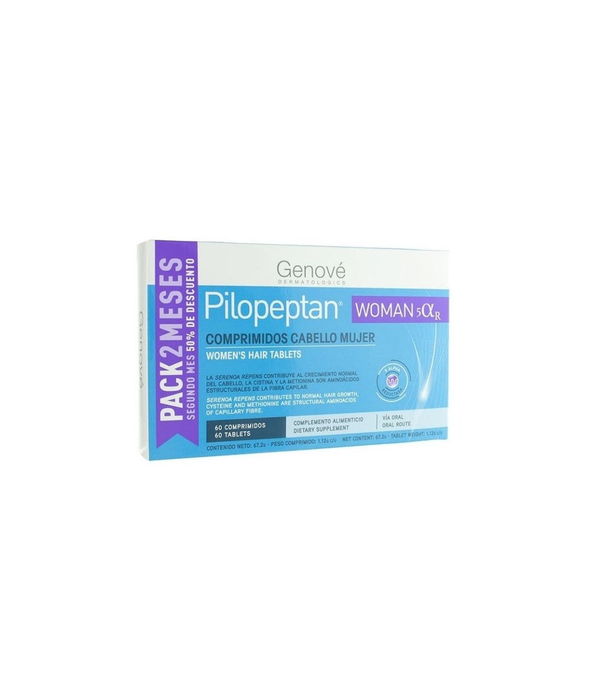 Pilopeptan Woman 5 Alfa Reductasa 60 comprimidos es un tratamiento nutricional especialmente formulado para mujeres con caída capilar de origen hormonal, como en casos de alopecia androgenética femenina o tras desequilibrios hormonales (menopausia, SOP, estrés…).