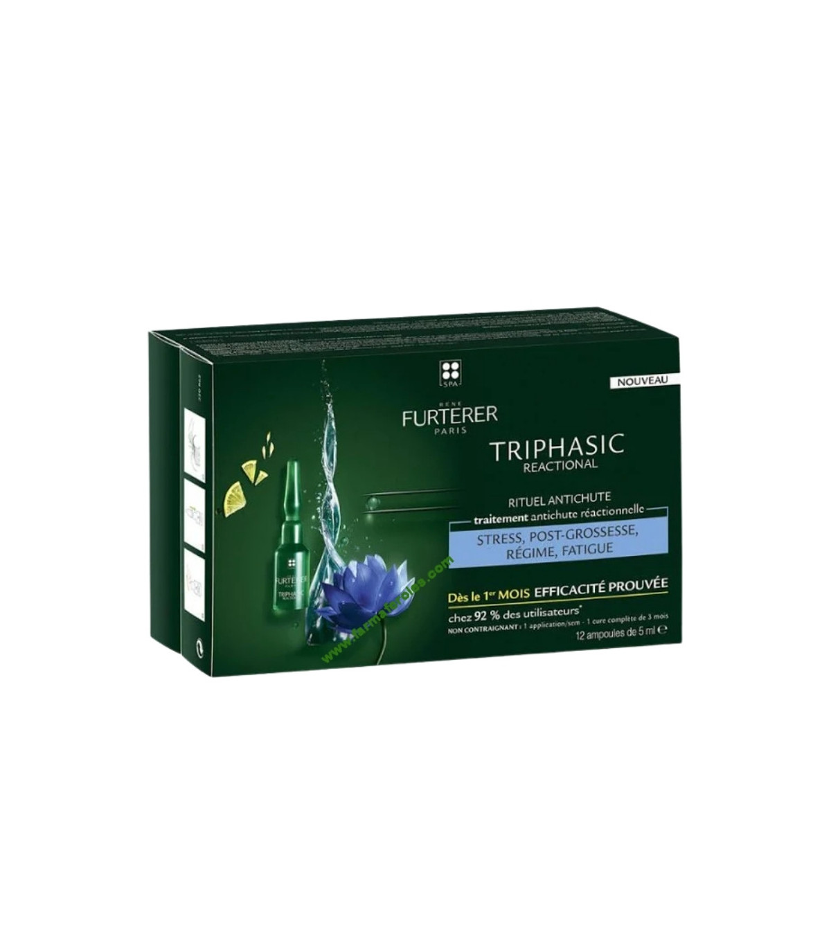 René Furterer Triphasic Reaccional Anticaída es un tratamiento capilar intensivo formulado para combatir la caída repentina del cabello provocada por estrés, fatiga, cambios hormonales o postparto. Su fórmula combina extracto de Pfaffia, arginina, ATP y una sinergia de aceites esenciales (lavanda, naranja, romero), que actúan directamente sobre el folículo piloso para reactivar el crecimiento y fortalecer el cabello desde la raíz.
