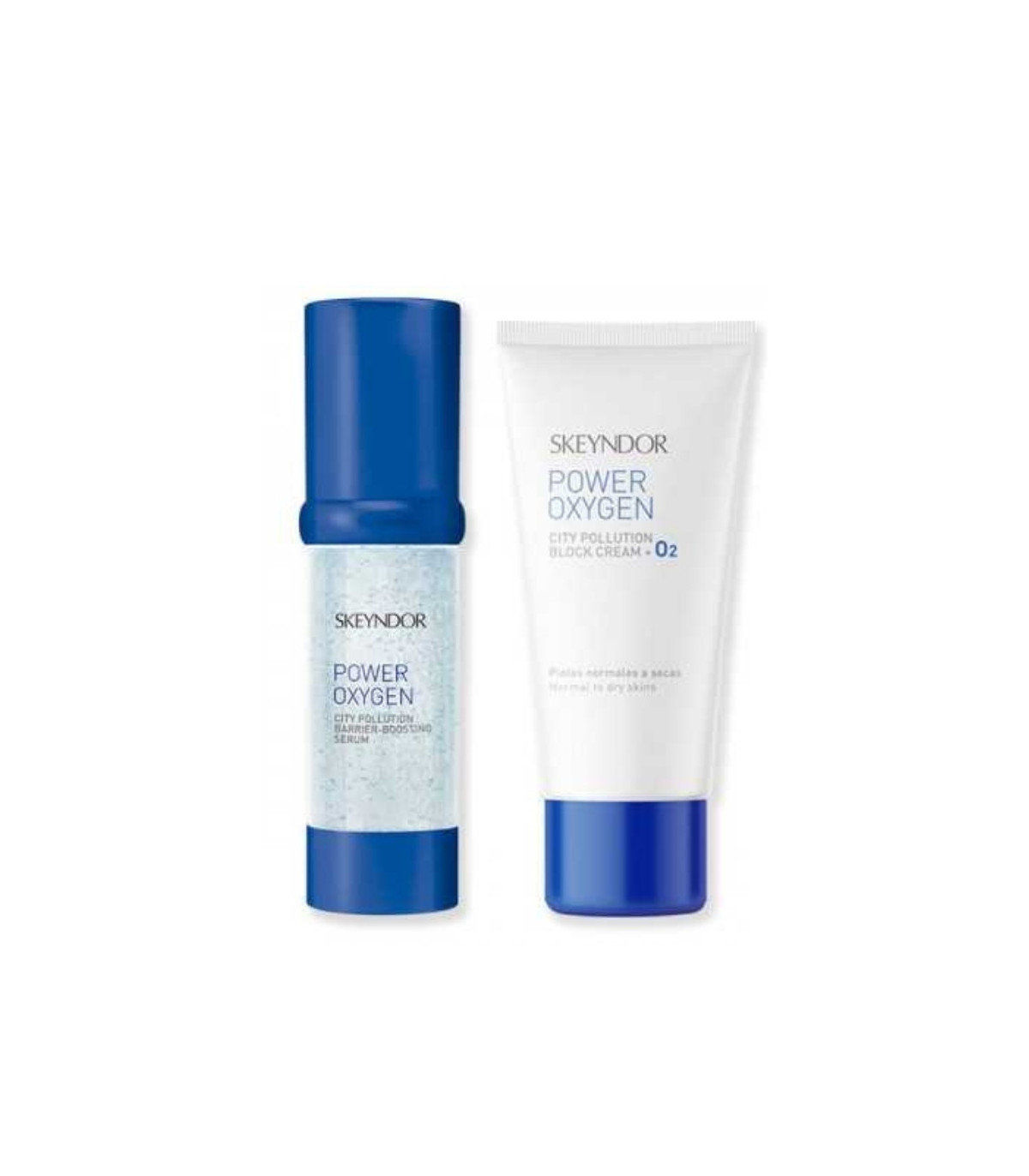 Kit Power Oxygen de Skeyndor, ideal para piel mixta, que revitaliza, hidrata y aporta un efecto luminoso y fresco. Incluye productos que mejoran la textura y la vitalidad de la piel.