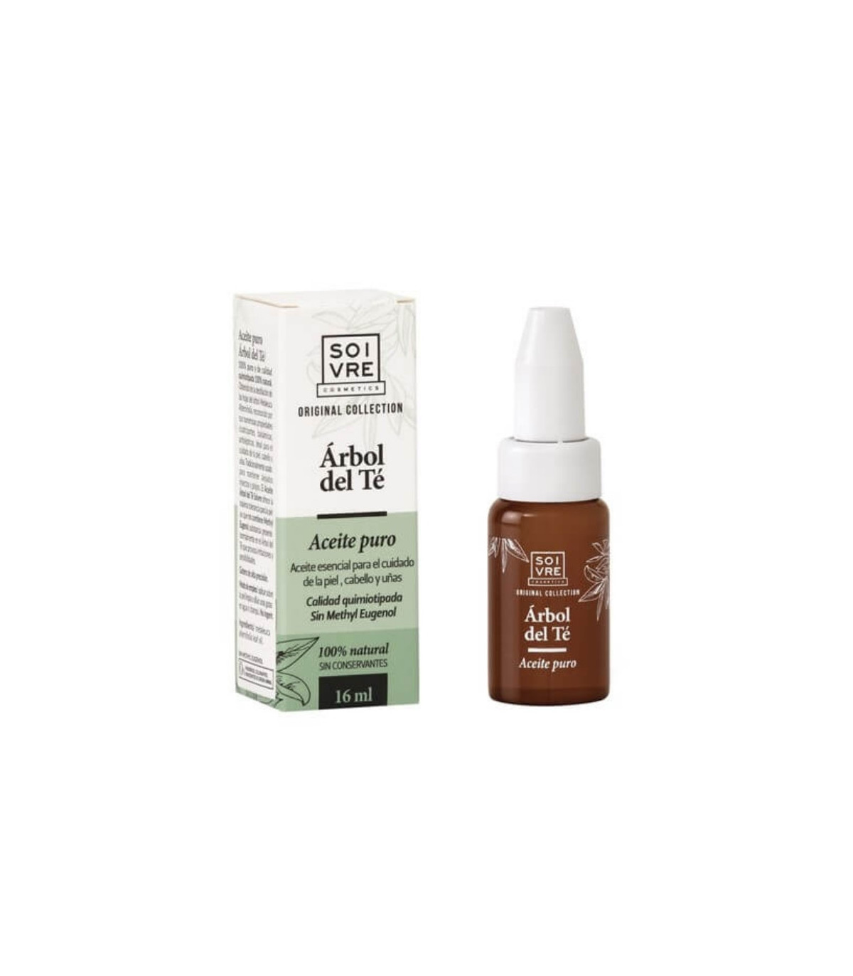 Aceite esencial puro de Árbol del Té Soivre en formato de 16 ml. Con propiedades antisépticas y purificantes, ideal para piel grasa, acné o irritaciones.