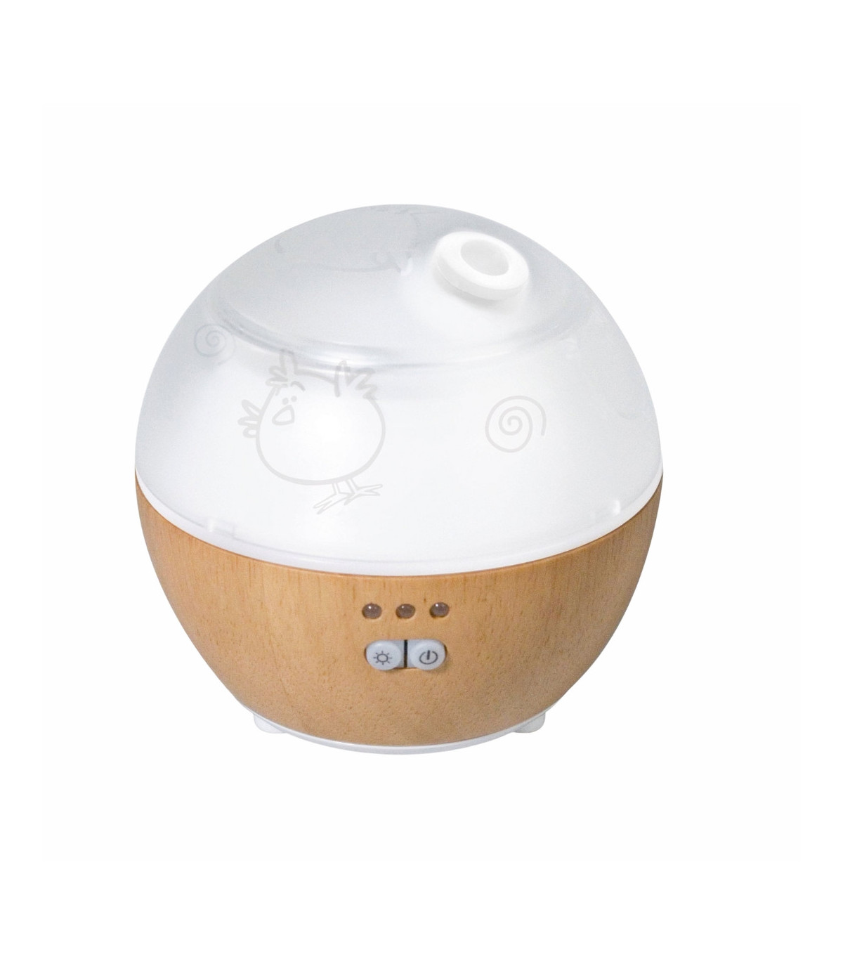Difusor ultrasónico en forma de esfera, especialmente diseñado para bebés. Humidifica el ambiente, difunde aceites esenciales en frío y emite luz LED suave. Seguro y silencioso.