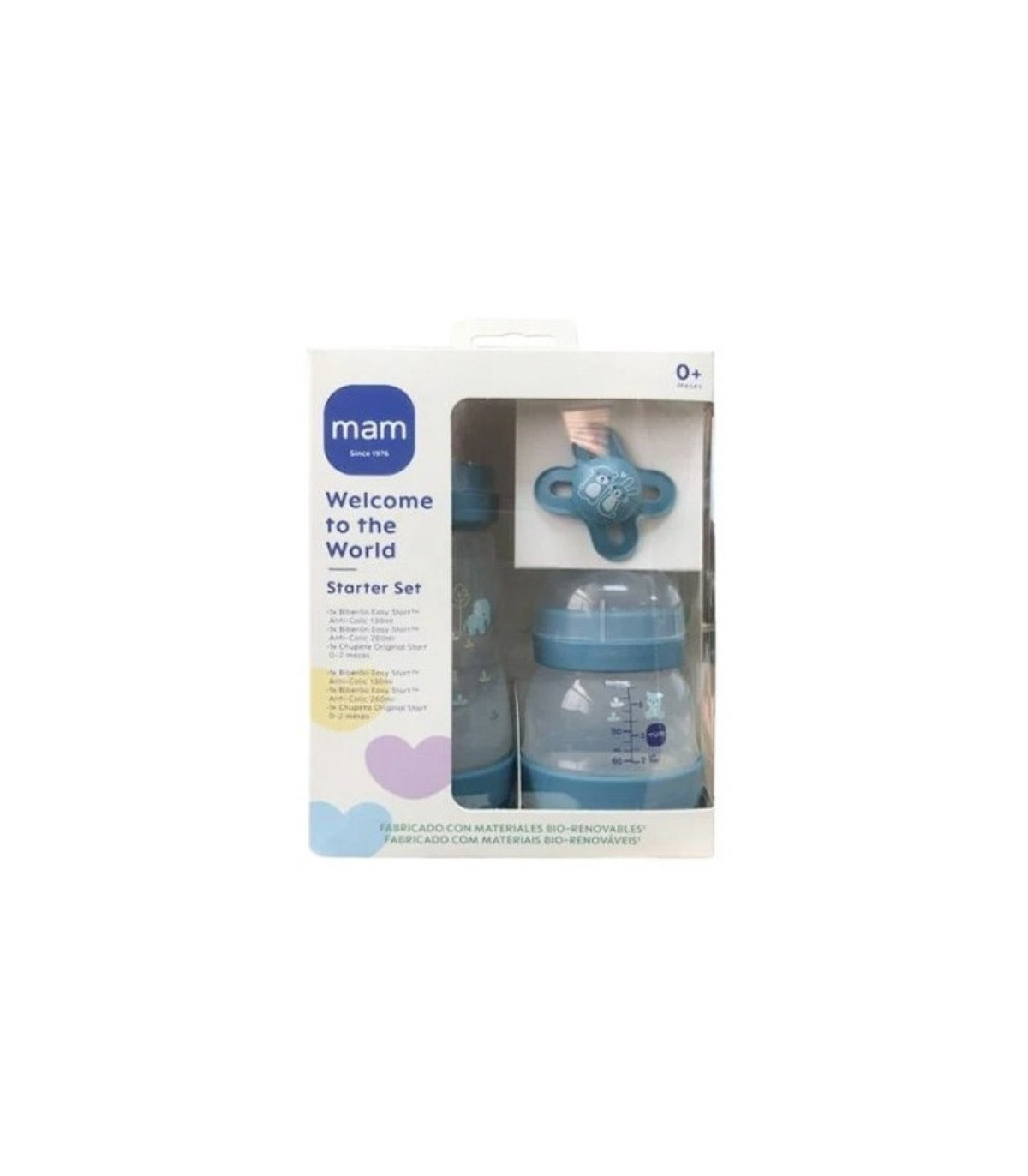 Set MAM Star 0 azul con chupete y biberón, ideal para bebés recién nacidos. Tetina SkinSoft™ suave y diseño ergonómico para máxima comodidad y seguridad.
