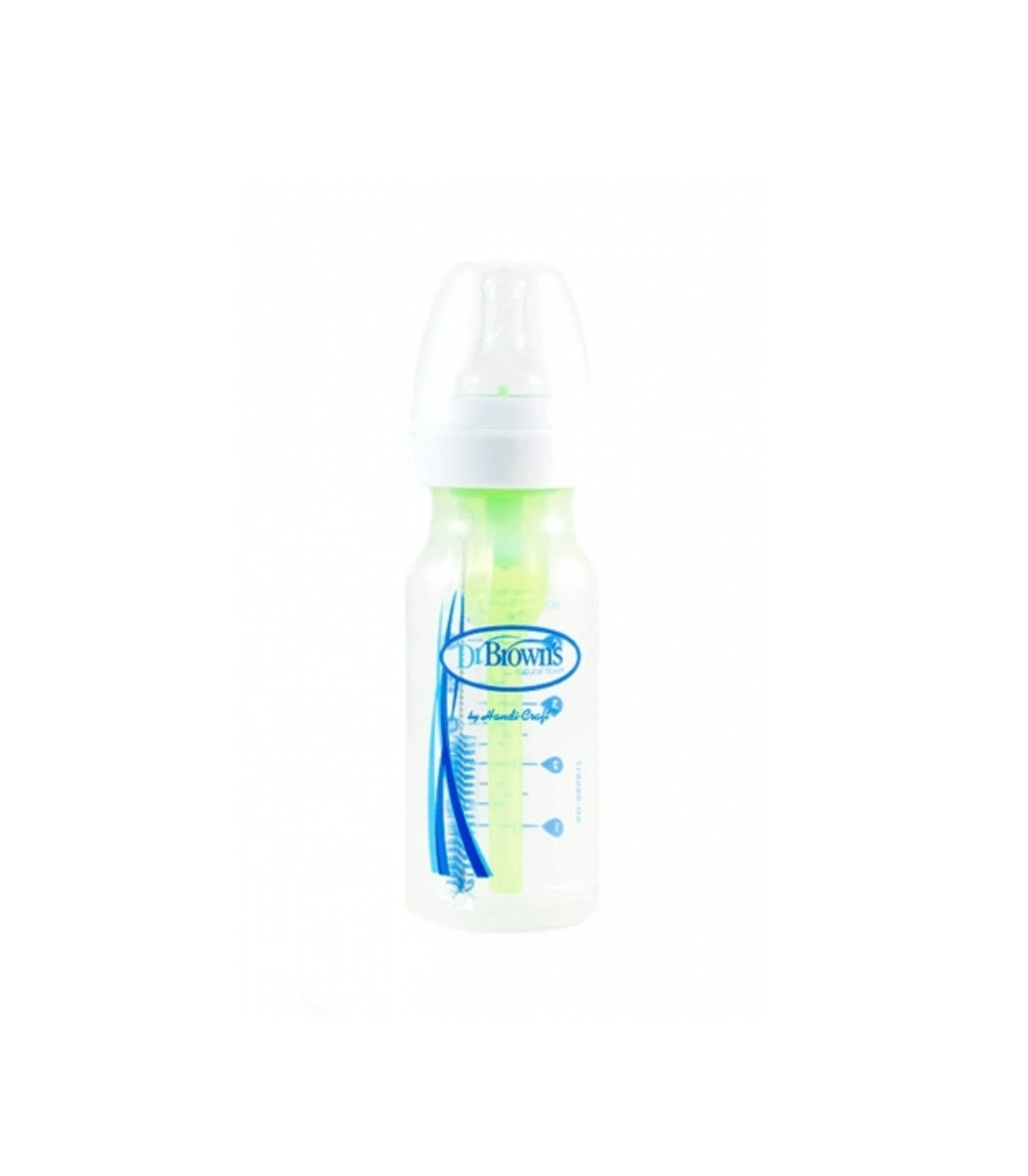 Biberón Dr. Brown's Standard 120 ml, diseñado con sistema anticólicos para reducir el aire ingerido, mejorando la experiencia de alimentación del bebé.