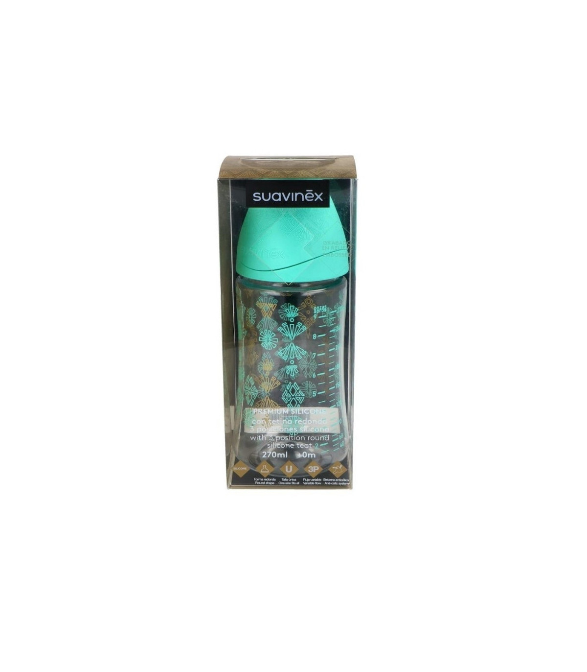 Biberón Suavinex Premium de 270 ml, con tetina de silicona regulable en 3 posiciones que facilita una alimentación suave y adaptada a cada etapa.