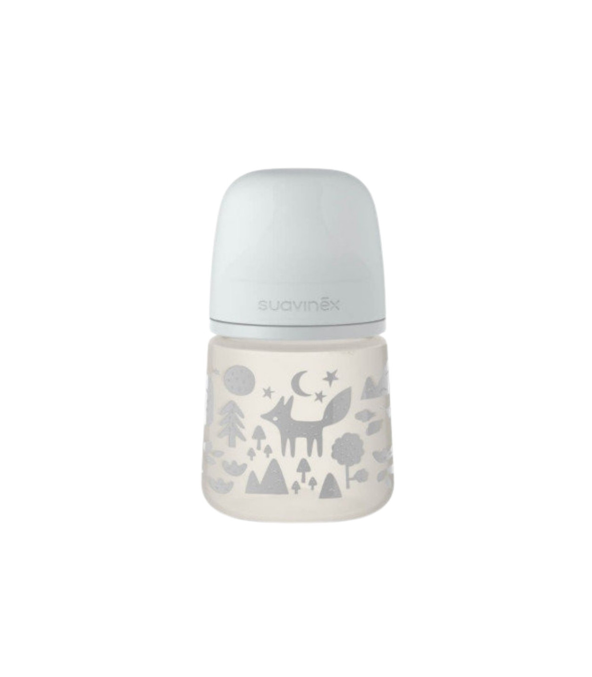 Biberón 150 ml con tetina fisiológica de silicona talla S. Flujo lento, diseñado para recién nacidos y primeras tomas.