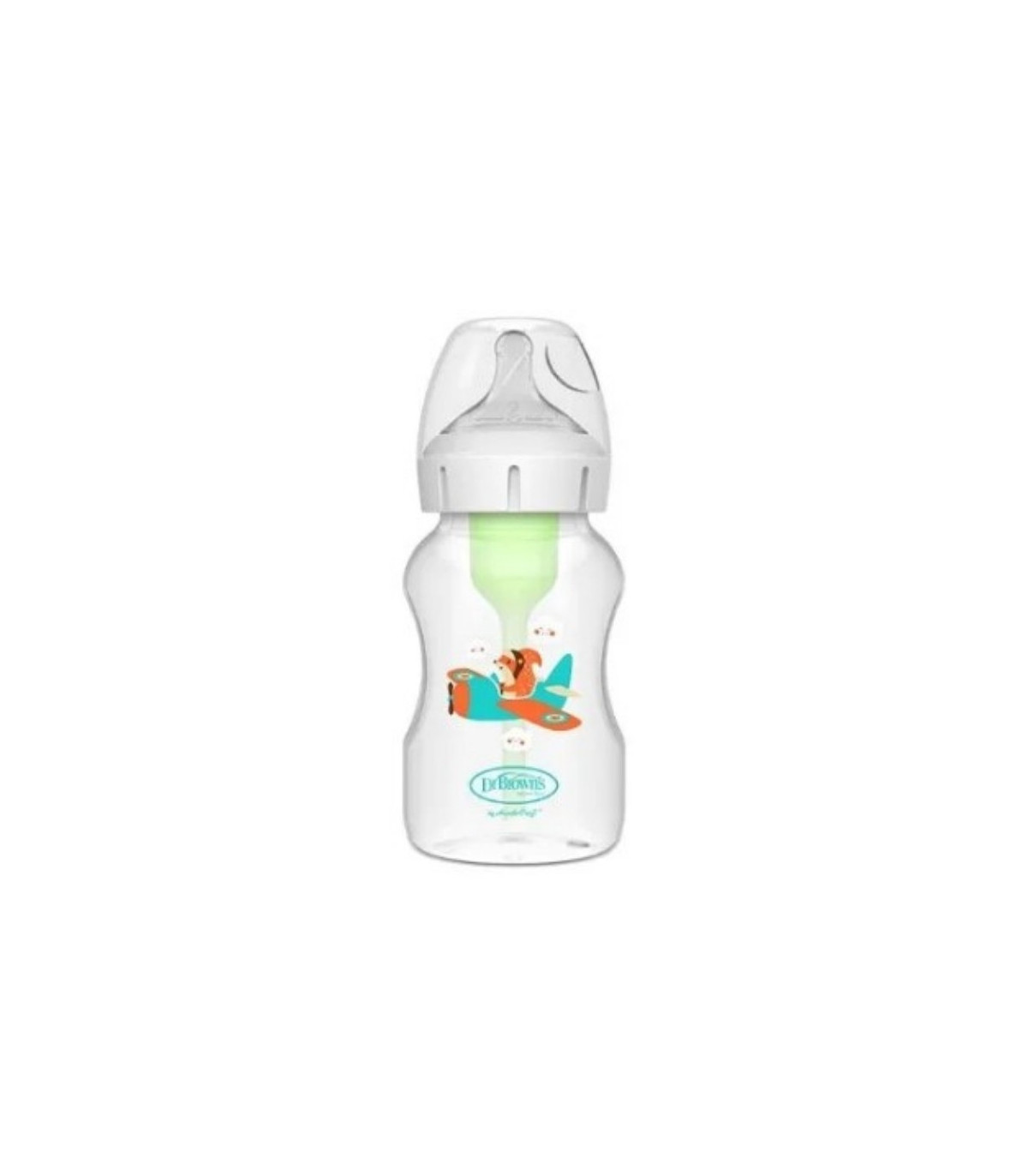 Biberón Dr. Brown’s boca ancha con tetina de silicona nivel 2, diseño divertido de ardilla y avión. Anti cólicos, fácil de limpiar, ideal para bebés desde 3 meses.