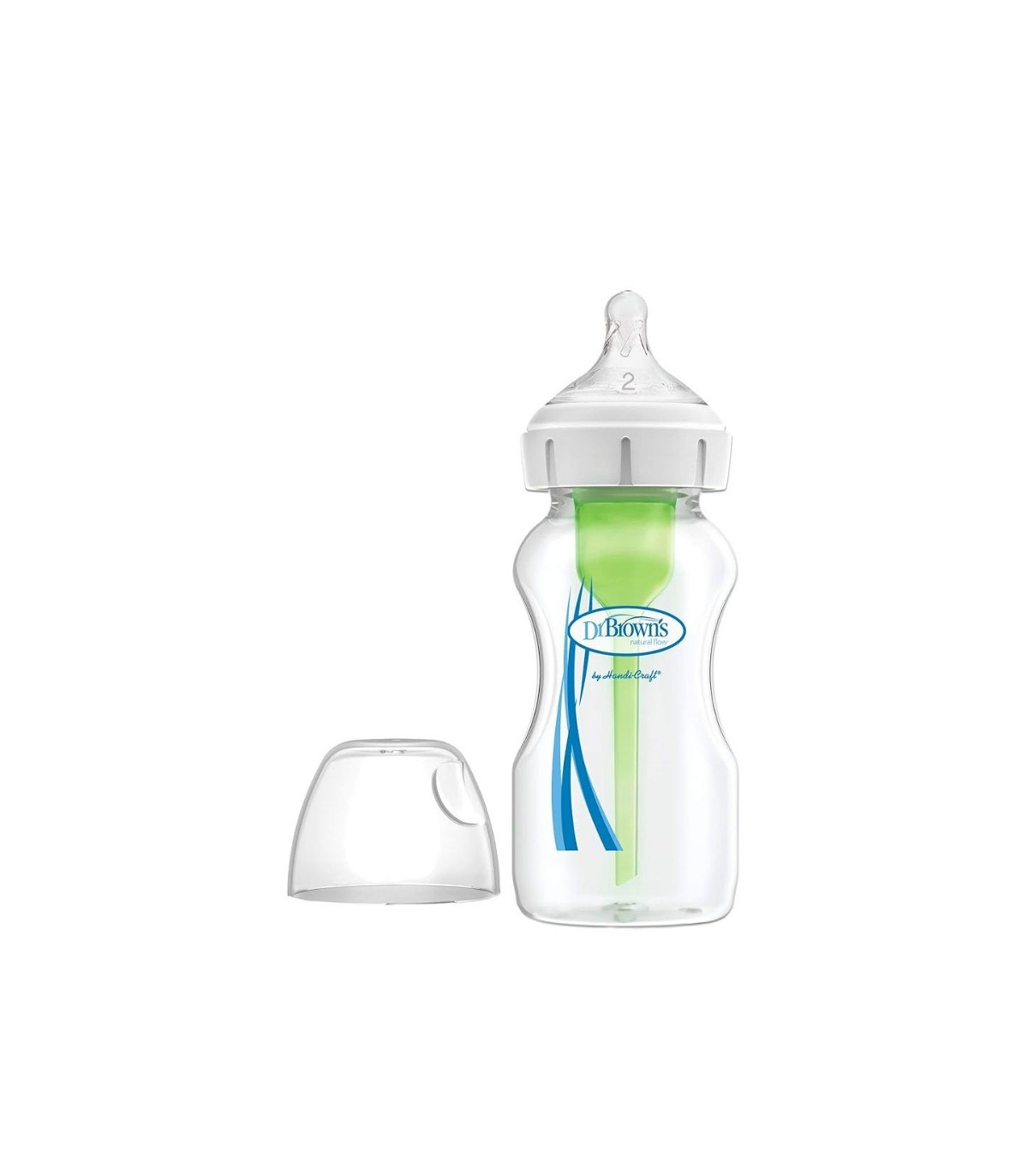 Biberón Dr. Brown's boca ancha 270 ml, sistema anticólicos para una alimentación cómoda y reducción de gases en el bebé.