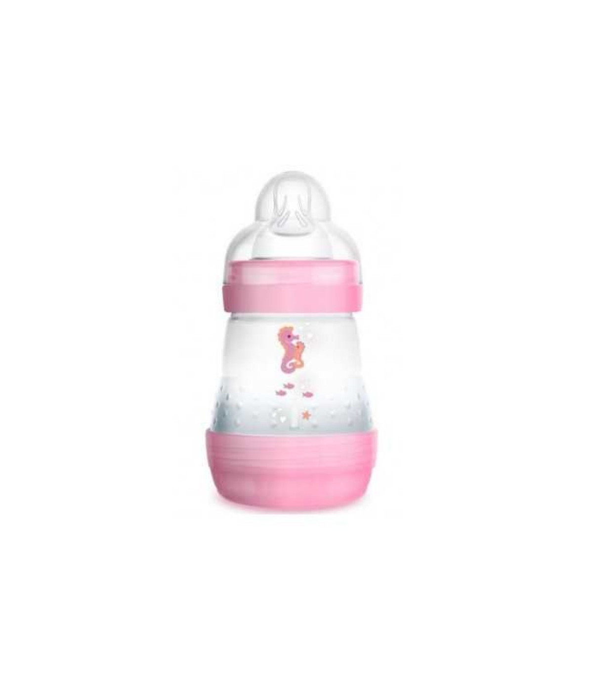 Biberón MAM anticólico 320 ml rosa con tetina SkinSoft™ y sistema que reduce gases y molestias. Diseño ergonómico y acabado mate para mayor comodidad y fácil limpieza.