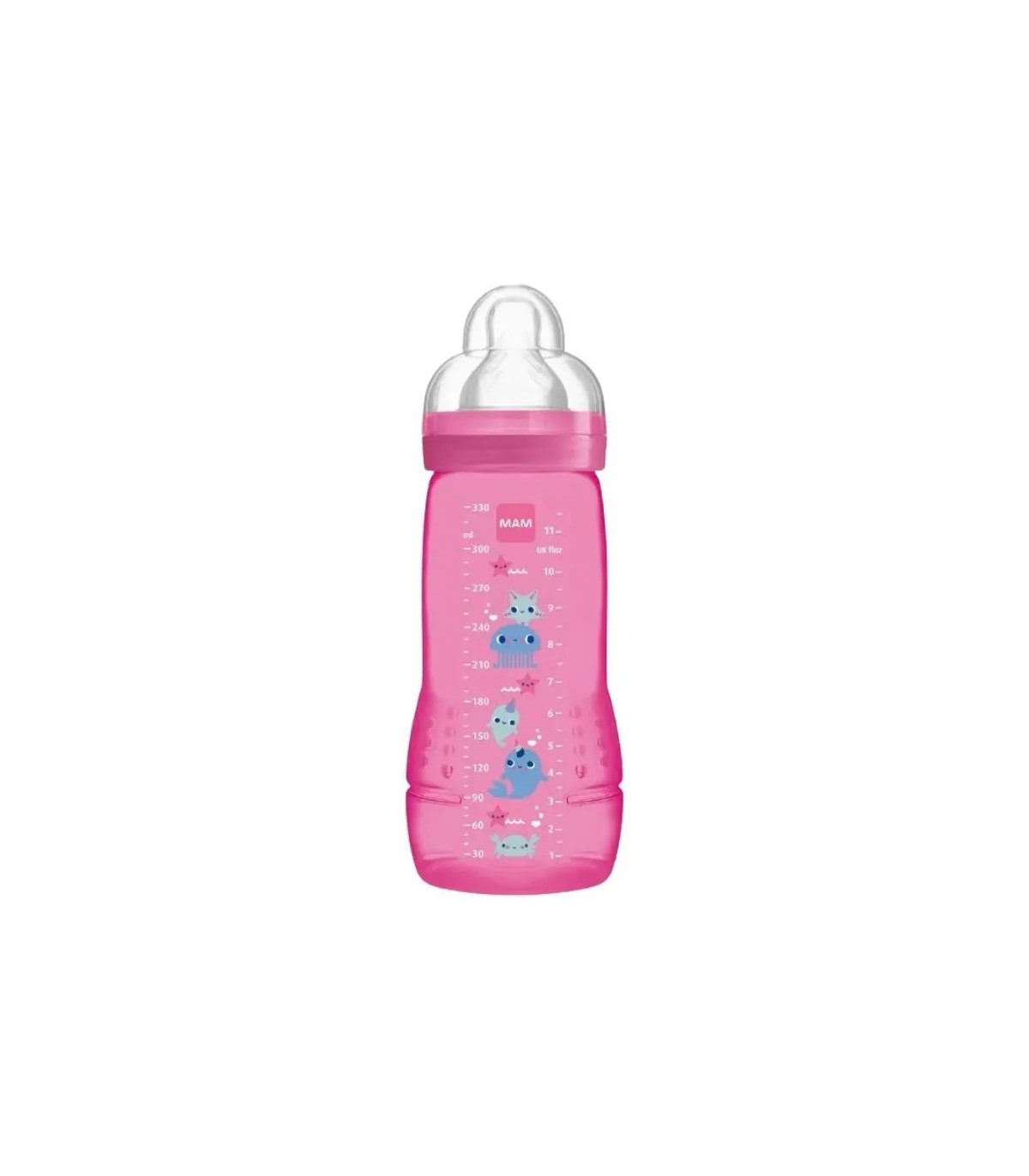 Biberón MAM Easy Active rosa de 330 ml con tetina SkinSoft™ de silicona y cuerpo ergonómico. Boca ancha para limpieza sencilla, libre de BPA/BPS, ideal para bebés desde 4 m.