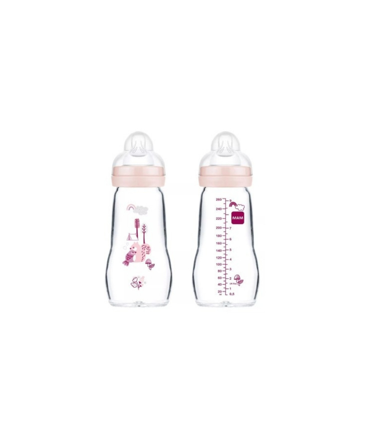 Biberón MAM Feel Good cristal 260 ml con tetina SkinSoft™, diseño ergonómico y sistema anticólico. Resistente, seguro y cómodo para bebés desde el nacimiento.