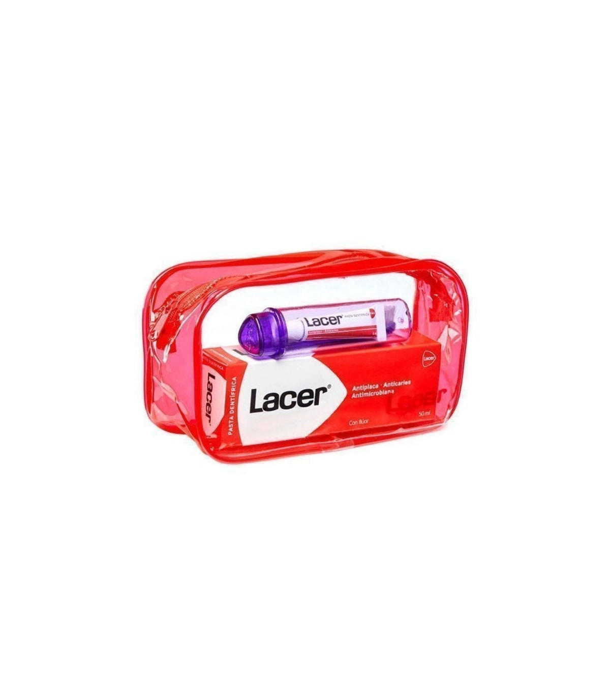 Kit de viaje Lacer con neceser y pasta dental de 50 ml. Ideal para llevar en bolso o maleta. Higiene bucal completa fuera de casa.