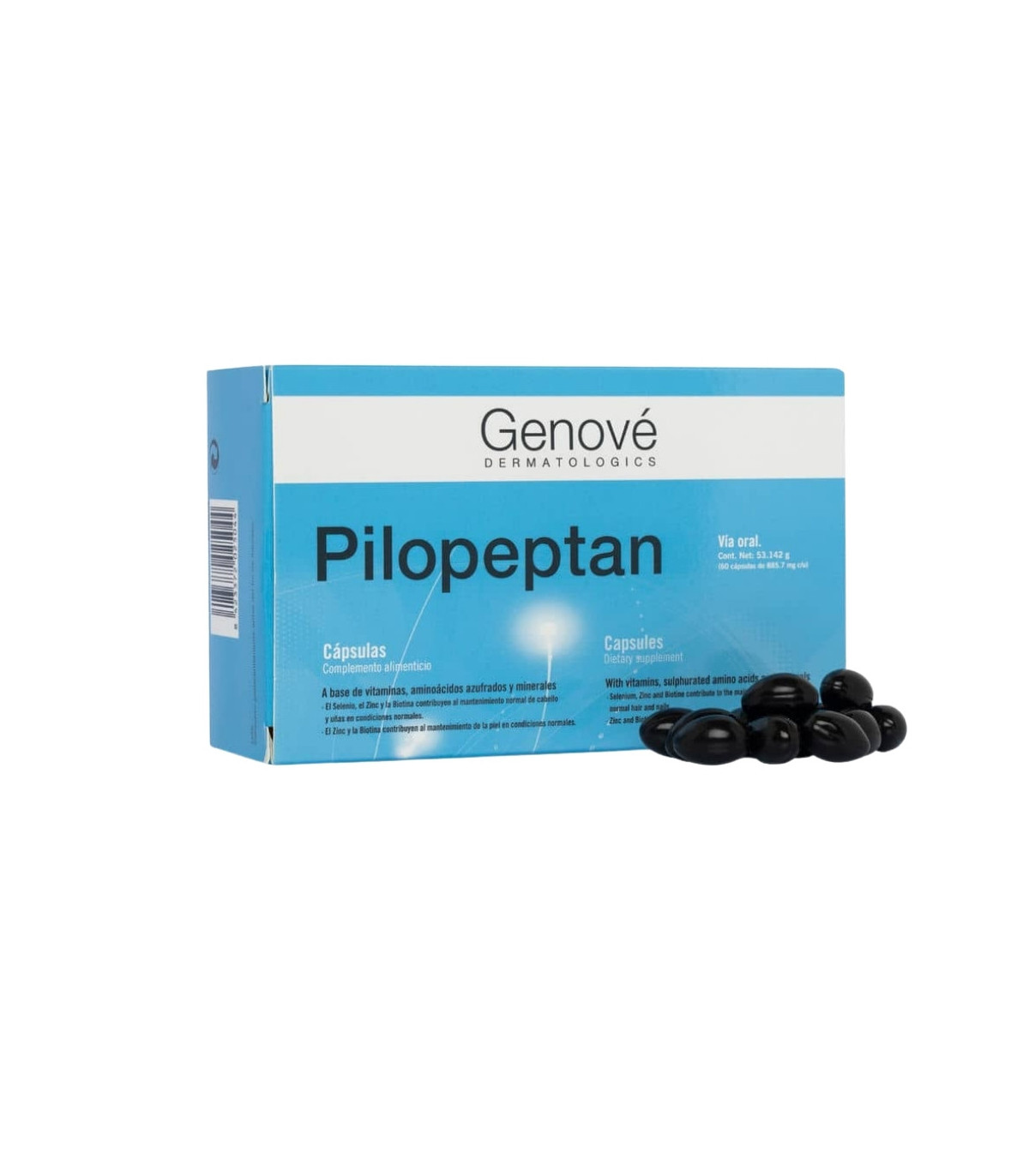 Pilopeptan Cápsulas 60 unidades es un complemento alimenticio formulado para combatir la caída del cabello de forma eficaz, reforzando su estructura y estimulando su crecimiento. Su fórmula combina vitaminas del grupo B, zinc, hierro, aminoácidos azufrados (como la cistina y metionina) y extractos vegetales, que nutren el folículo piloso desde el interior.