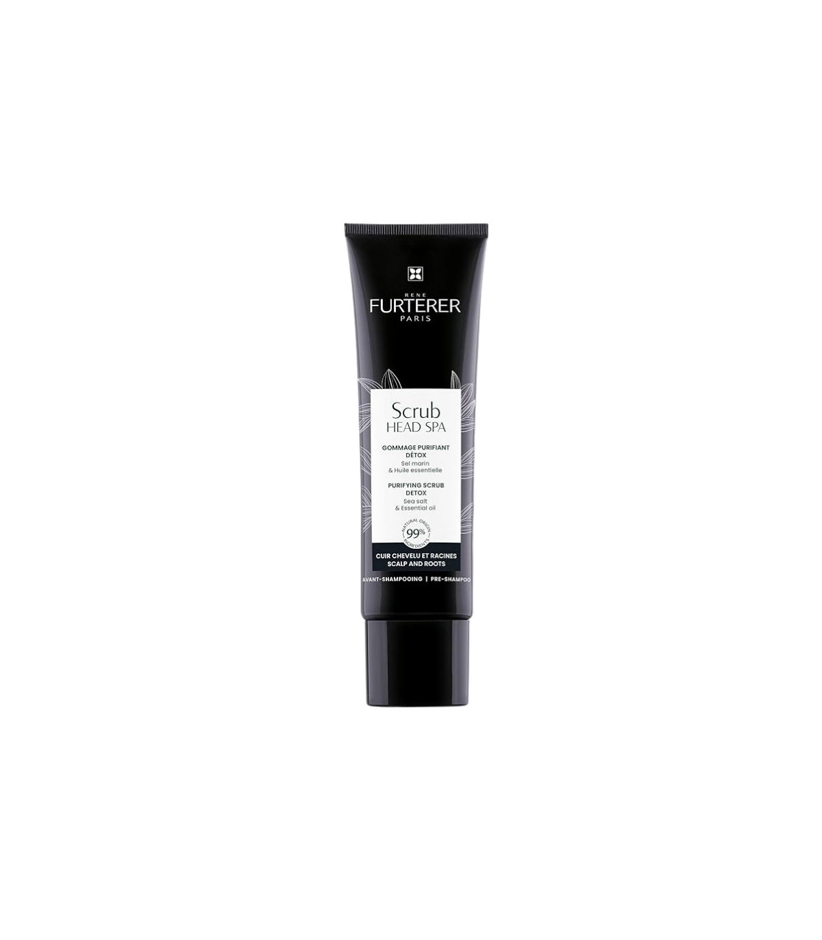 Head Spa Scrub de René Furterer exfolia y purifica el cuero cabelludo con sal marina y aceites esenciales. Cabello limpio, suelto y revitalizado.