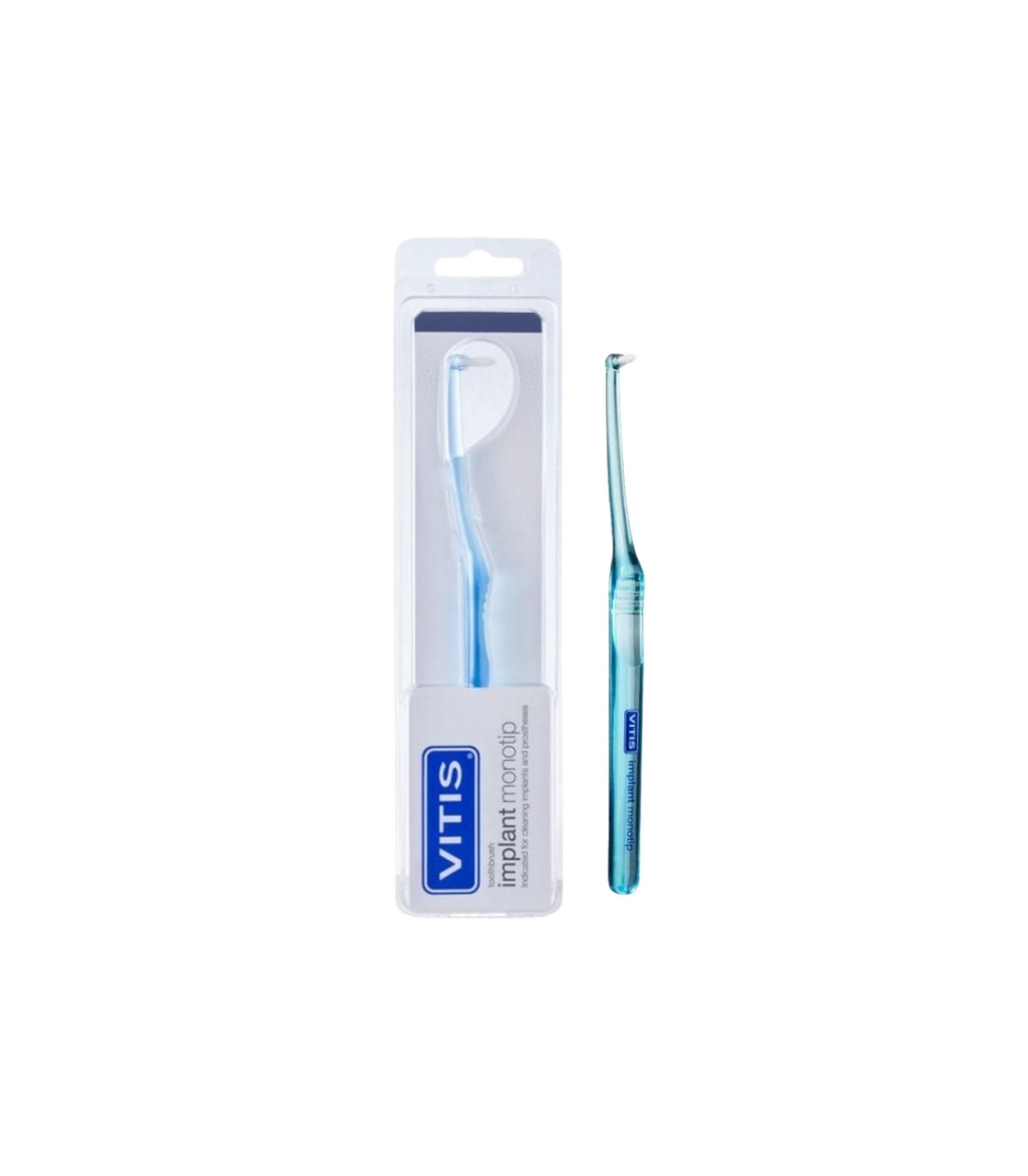 Vitis Implant Monotip es un cepillo dental diseñado con un único penacho de filamentos suaves, ideal para la limpieza específica de zonas de difícil acceso como implantes dentales, prótesis, coronas, puentes, y áreas interdentales amplias. Su diseño permite una higiene precisa sin dañar los tejidos ni los materiales restauradores.