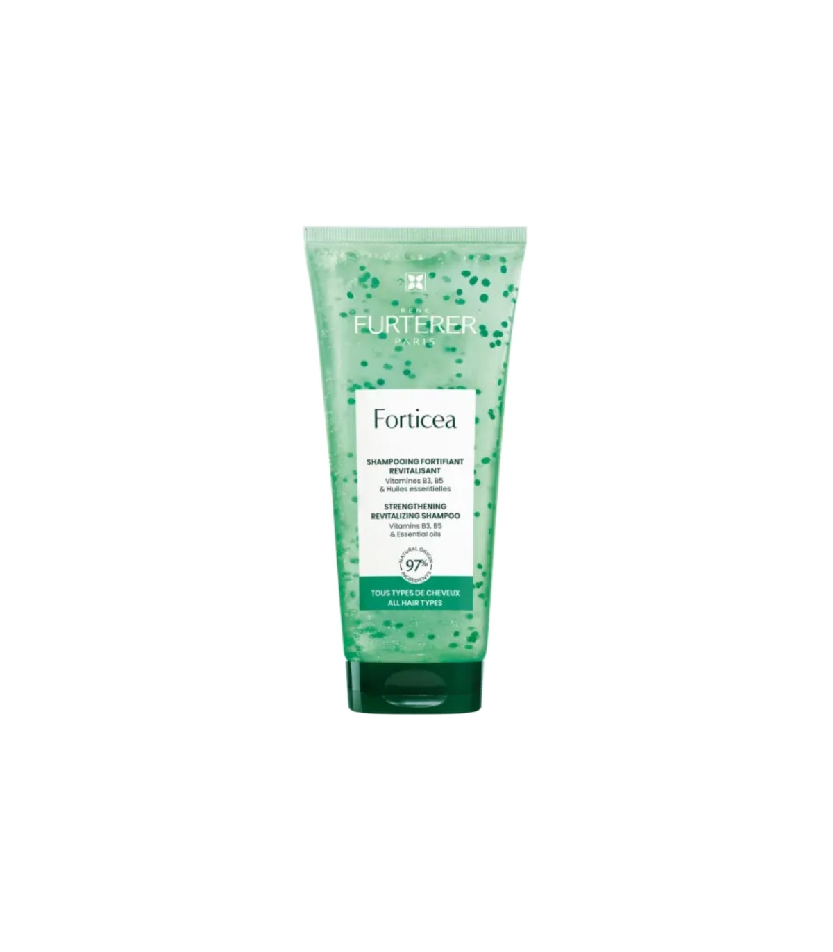 René Furterer Forticea Champú Estimulante 200 ml es un champú energizante que aporta vitalidad, fuerza y resistencia al cabello desde la raíz. Su fórmula está enriquecida con extracto de guaraná, conocido por su efecto tonificante, y una combinación de aceites esenciales de naranja, lavanda y romero, que estimulan la microcirculación del cuero cabelludo.