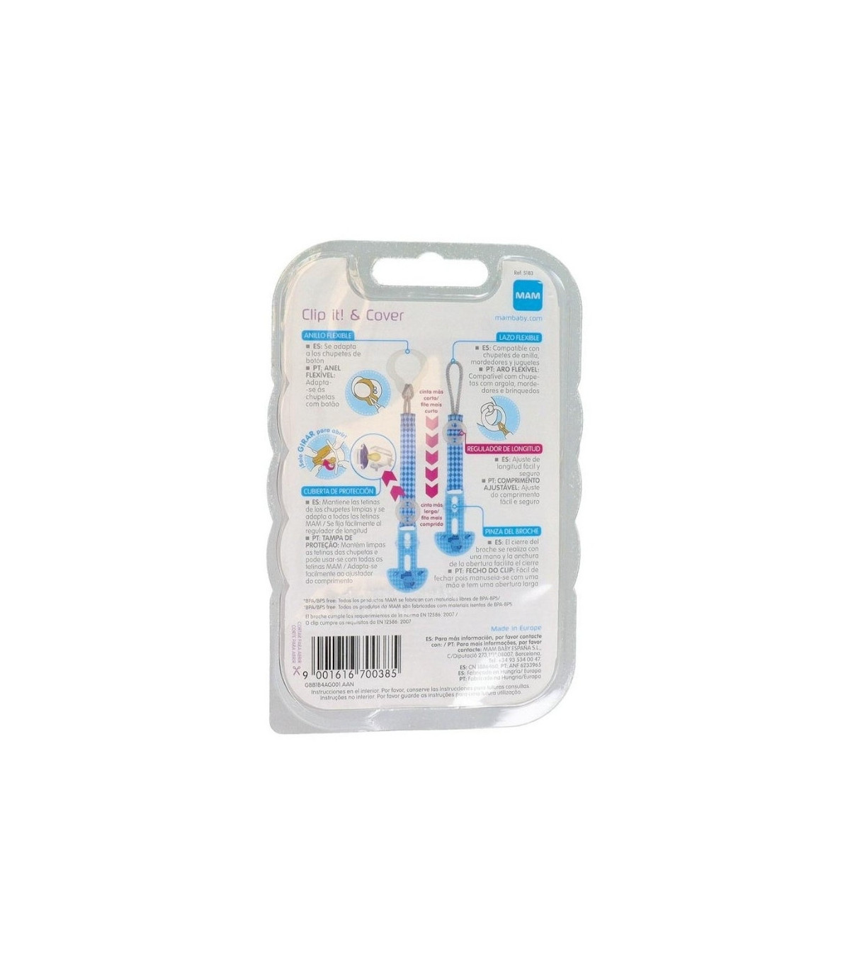 El Broche MAM Clip It! & Cover es un accesorio imprescindible para mantener el chupete del bebé siempre limpio, seguro y a su alcance. Su sistema de sujeción permite engancharlo fácilmente a la ropa del niño, evitando caídas y pérdidas.