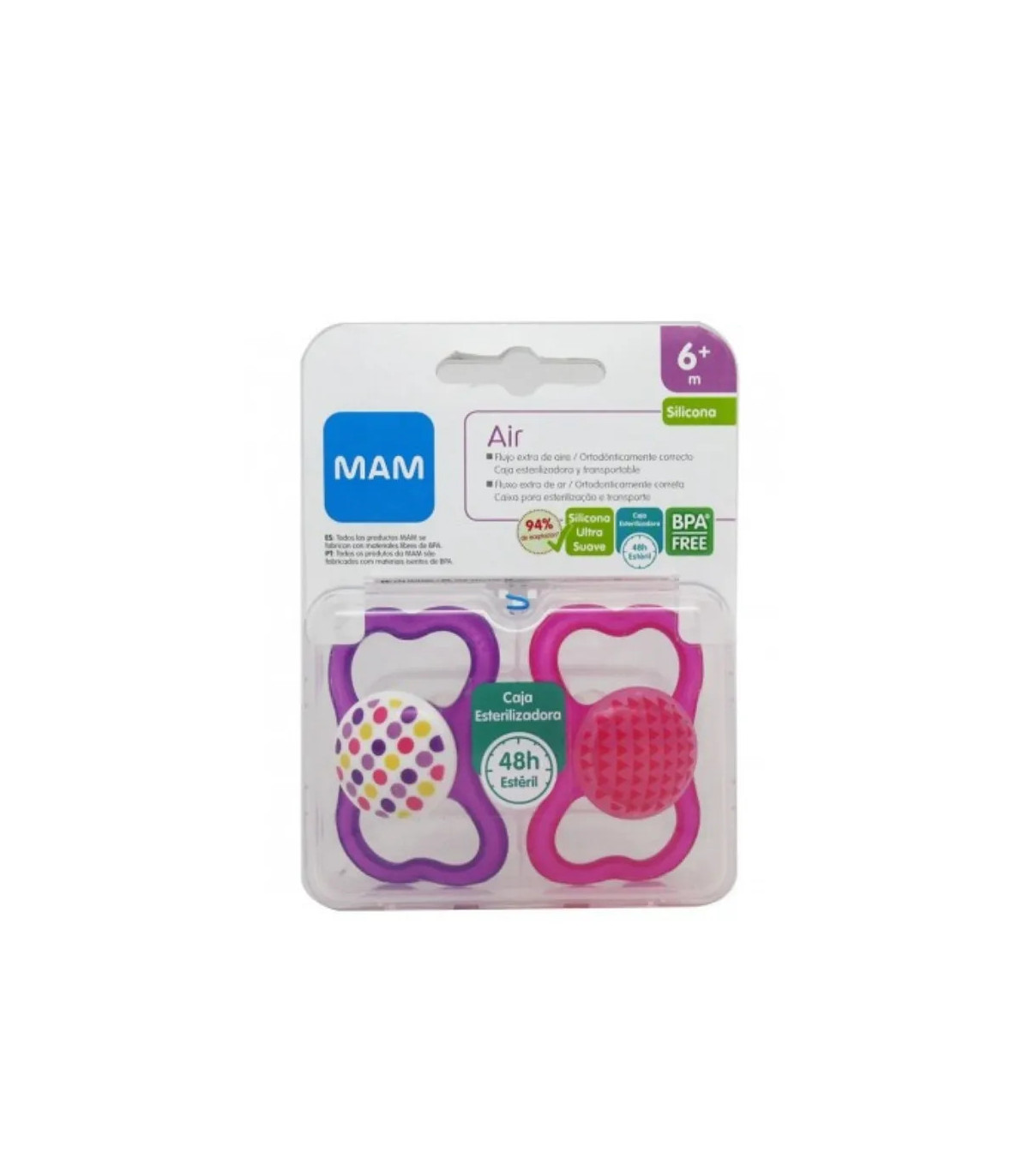 Chupete MAM Air Silicona Rosa 6m+, con diseño ligero y ventilado. Tetina ultrasuave que respeta dientes y encías del bebé.