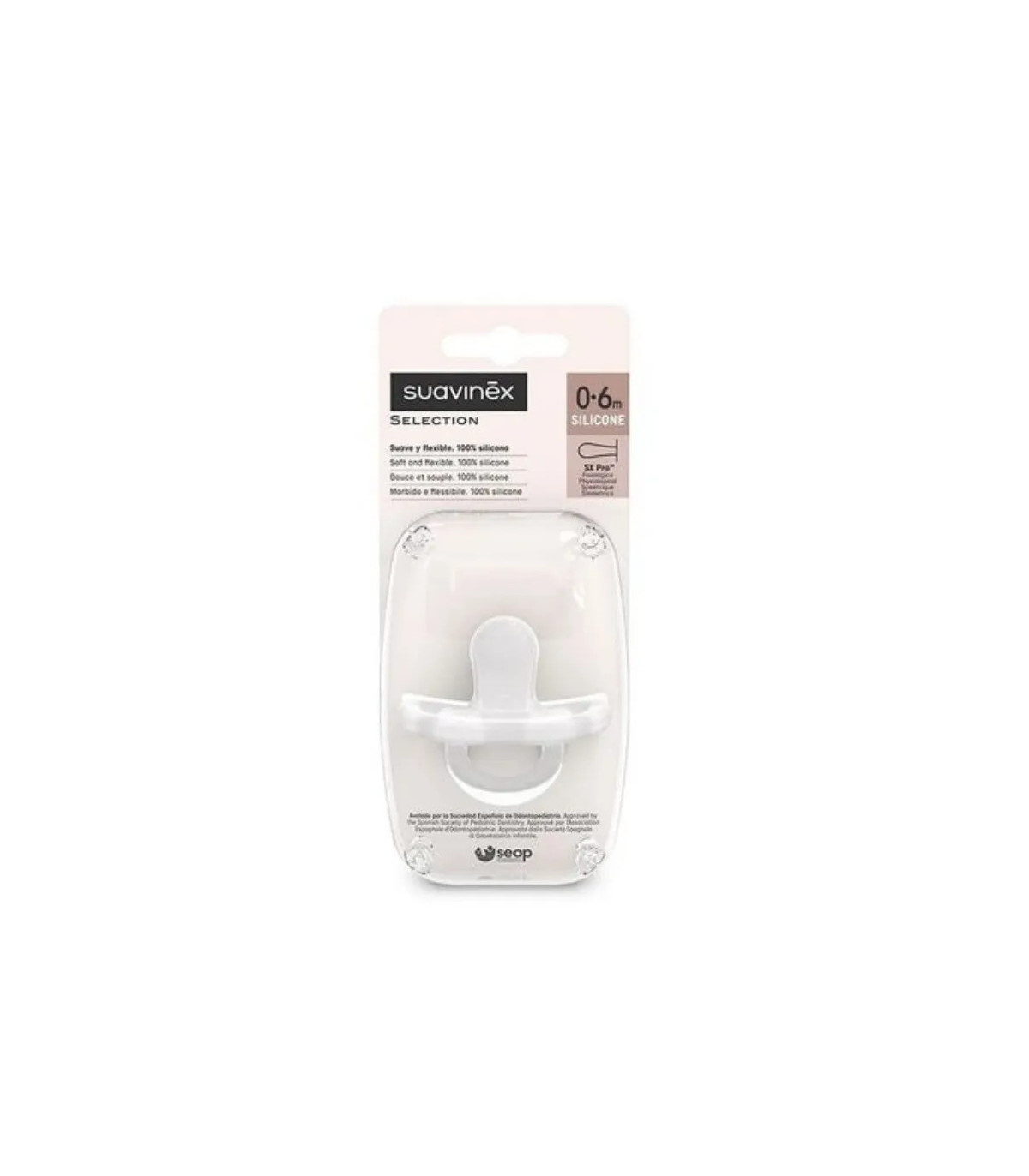 Chupete Suavinex Todo Silicona +6 meses, fabricado en una sola pieza de silicona médica. Máxima suavidad, higiene y seguridad para el bebé.
