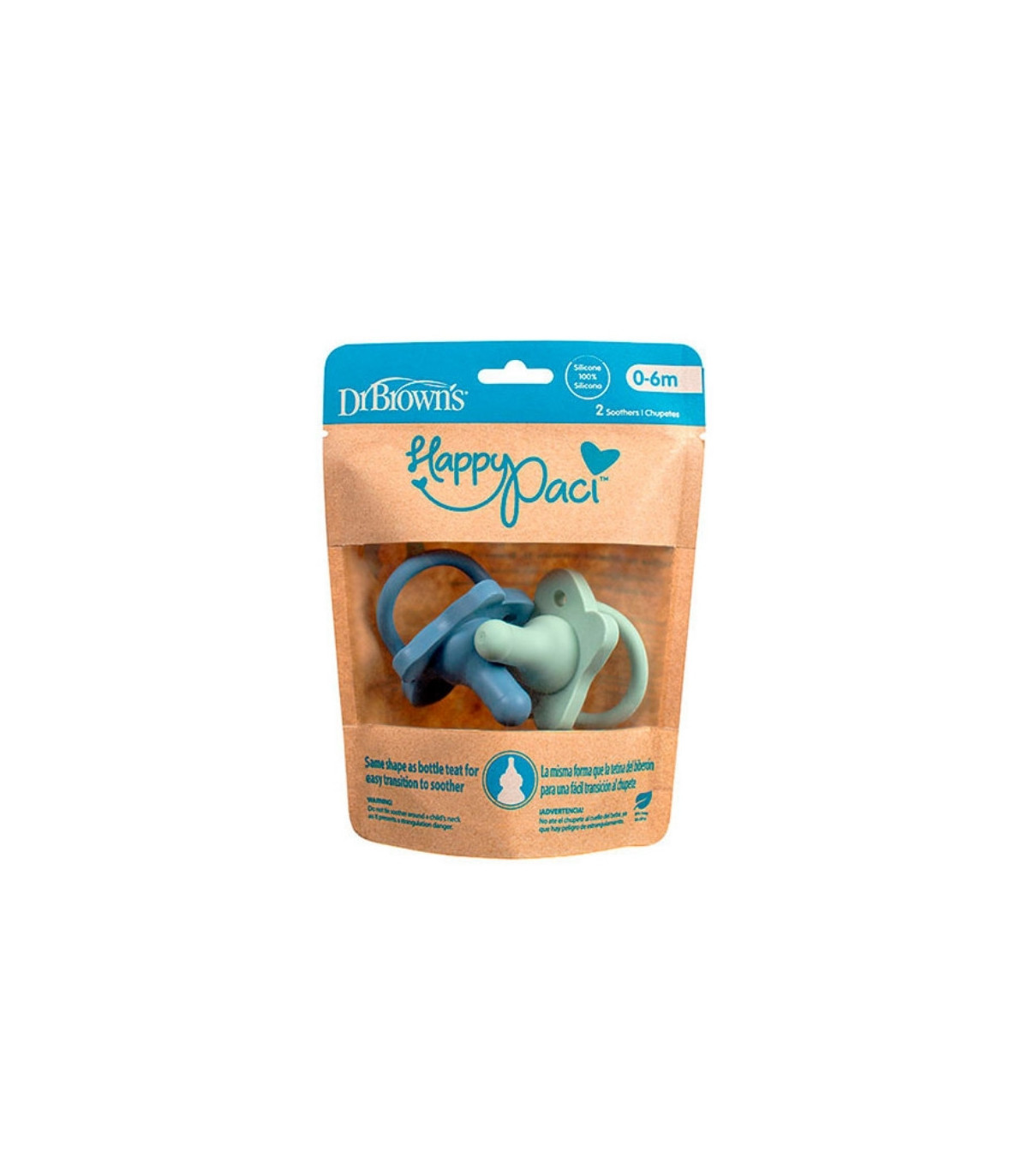 Pack de 2 chupetes Dr. Brown’s de silicona en colores azul y verde. Diseñados para garantizar comodidad, seguridad y un ajuste natural al bebé.