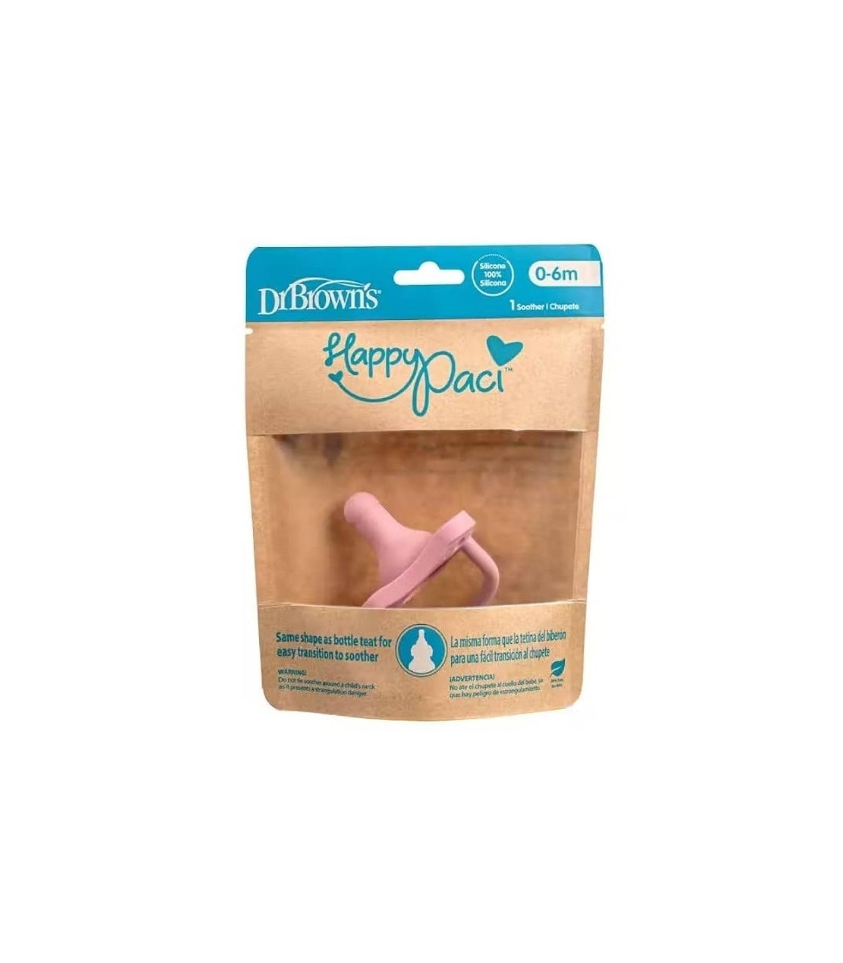 El chupete Dr. Brown’s HappyPaci rosa (0‑6 meses) está fabricado en silicona médica de una sola pieza, lo que asegura una mayor higiene y resistencia. Su tetina comparte la forma estrecha característica de los biberones Dr. Brown’s, facilitando una transición suave entre el biberón y el chupete.