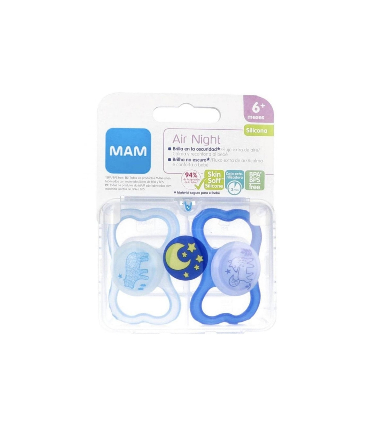 Pack de 2 chupetes MAM Baby Air Silicona 6m+, ultraligeros y ventilados. Tetina SkinSoft que imita la suavidad de la piel materna.
