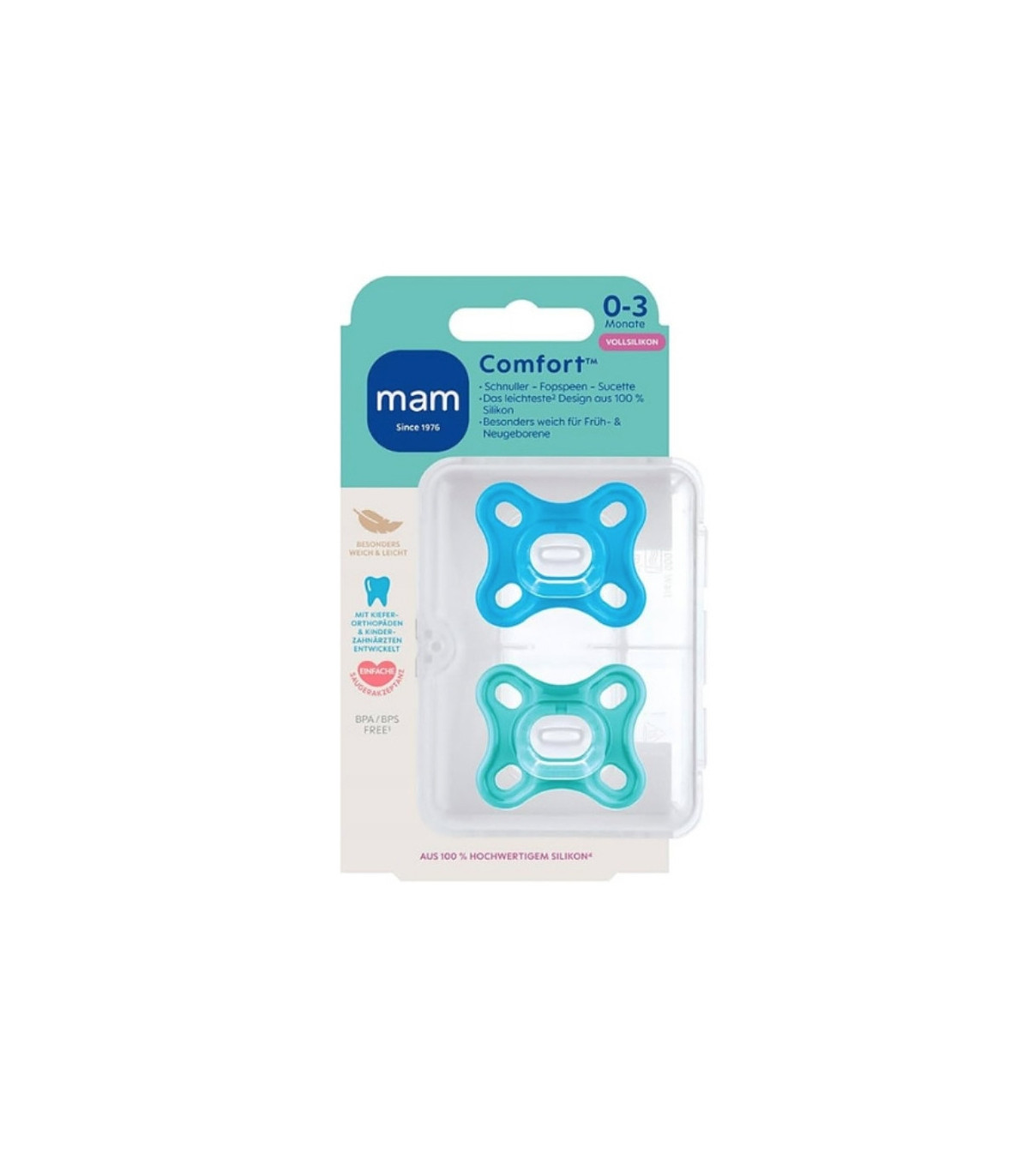 MAM Chupete Confort Azul, ideal para bebés de 3 a 12 meses. Silicona ultrasuave, diseño ergonómico y seguro para las encías y dientes.