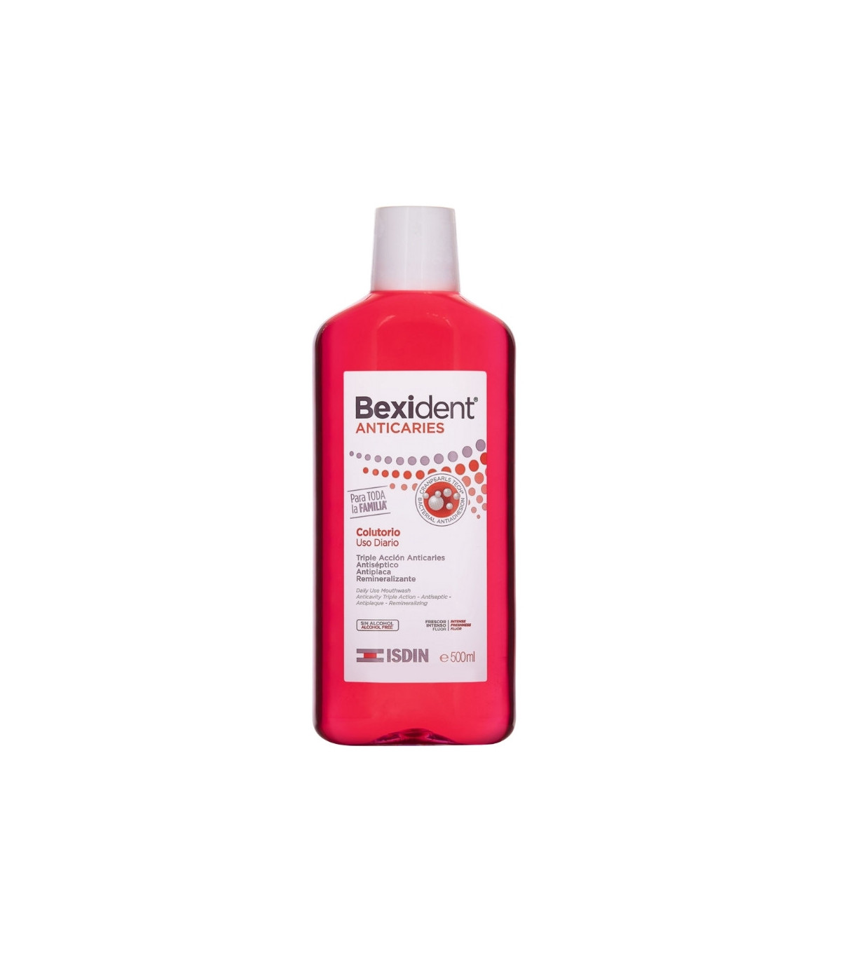 Bexident Anticaries Colutorio 500 ml es un enjuague bucal formulado para prevenir eficazmente la aparición de caries, fortalecer el esmalte dental y proteger frente a la placa bacteriana. Su fórmula avanzada incluye fluoruro sódico y xylitol, que actúan sinérgicamente para remineralizar los dientes y frenar el desarrollo de bacterias cariogénicas.