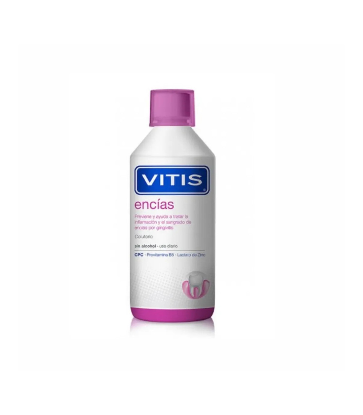 Vitis Encías Colutorio 500 ml es un enjuague bucal especialmente formulado para prevenir y tratar los problemas leves de encías, como la inflamación, el sangrado o la sensibilidad. Su fórmula contiene cloruro de cetilpiridinio (CPC), un antiséptico eficaz que combate la placa bacteriana, y activos como la provitamina B5 y la alantoína, que fortalecen y regeneran los tejidos gingivales.