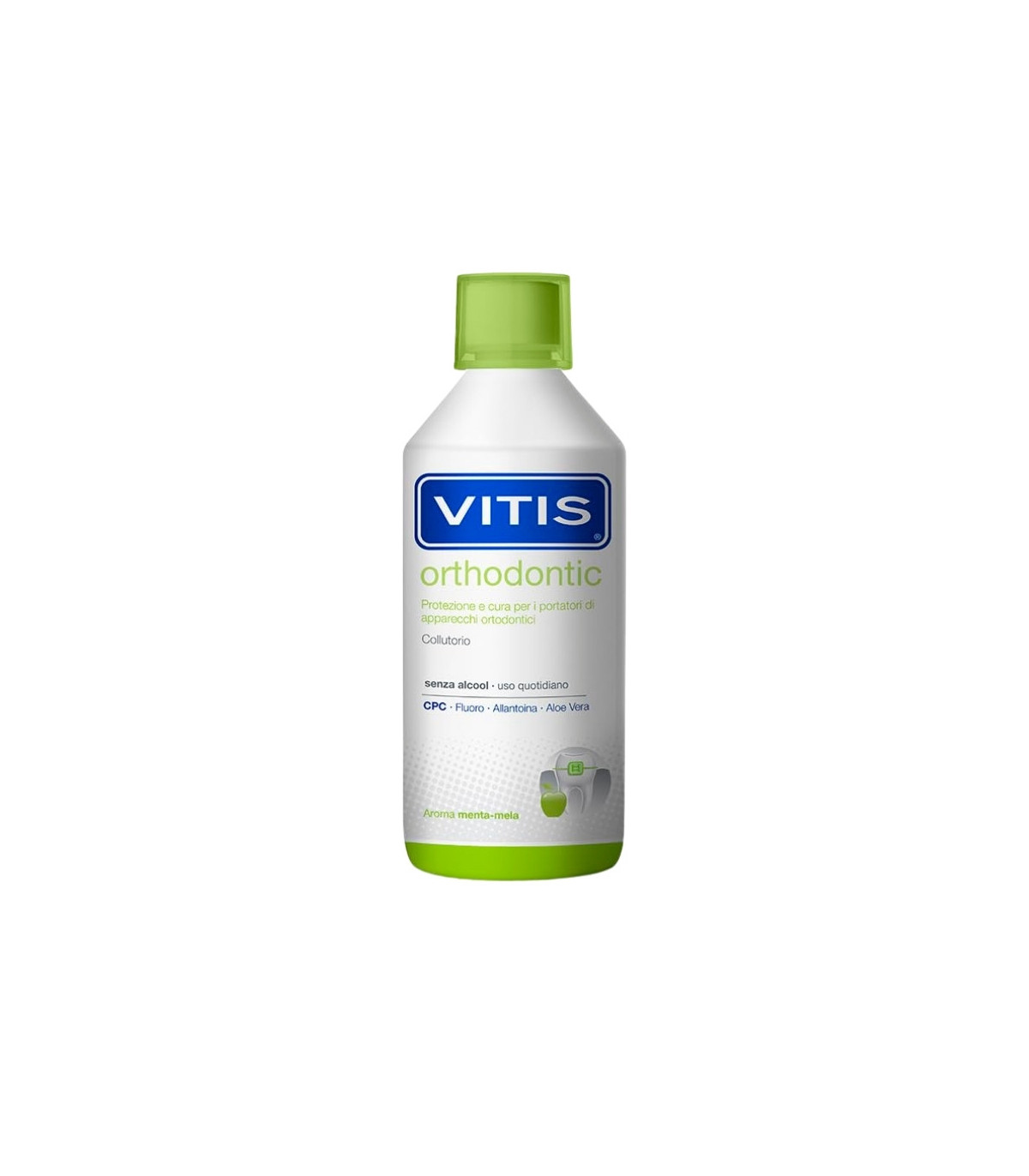 Vitis Orthodontic Colutorio 500 ml está específicamente formulado para personas con aparatos de ortodoncia, ofreciendo un cuidado integral que complementa el cepillado diario. Su fórmula contiene fluoruro sódico, que refuerza el esmalte dental y previene la descalcificación, y cloruro de cetilpiridinio (CPC), un antiséptico que combate la placa y protege las encías.