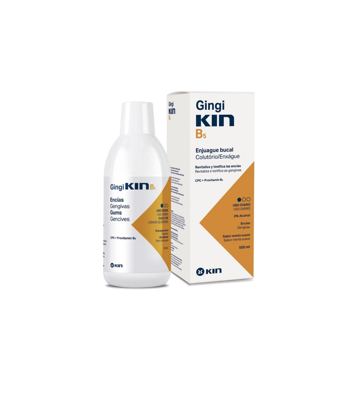 Gingi·Kin B5 Plus Enjuague Bucal 500 ml es un colutorio formulado para el cuidado intensivo de encías delicadas o con signos de gingivitis. Contiene clorhexidina al 0,12%, un antiséptico de alta eficacia que reduce la placa bacteriana y combate la inflamación, junto con provitamina B5 y alantoína, que favorecen la regeneración y protección del tejido gingival.
