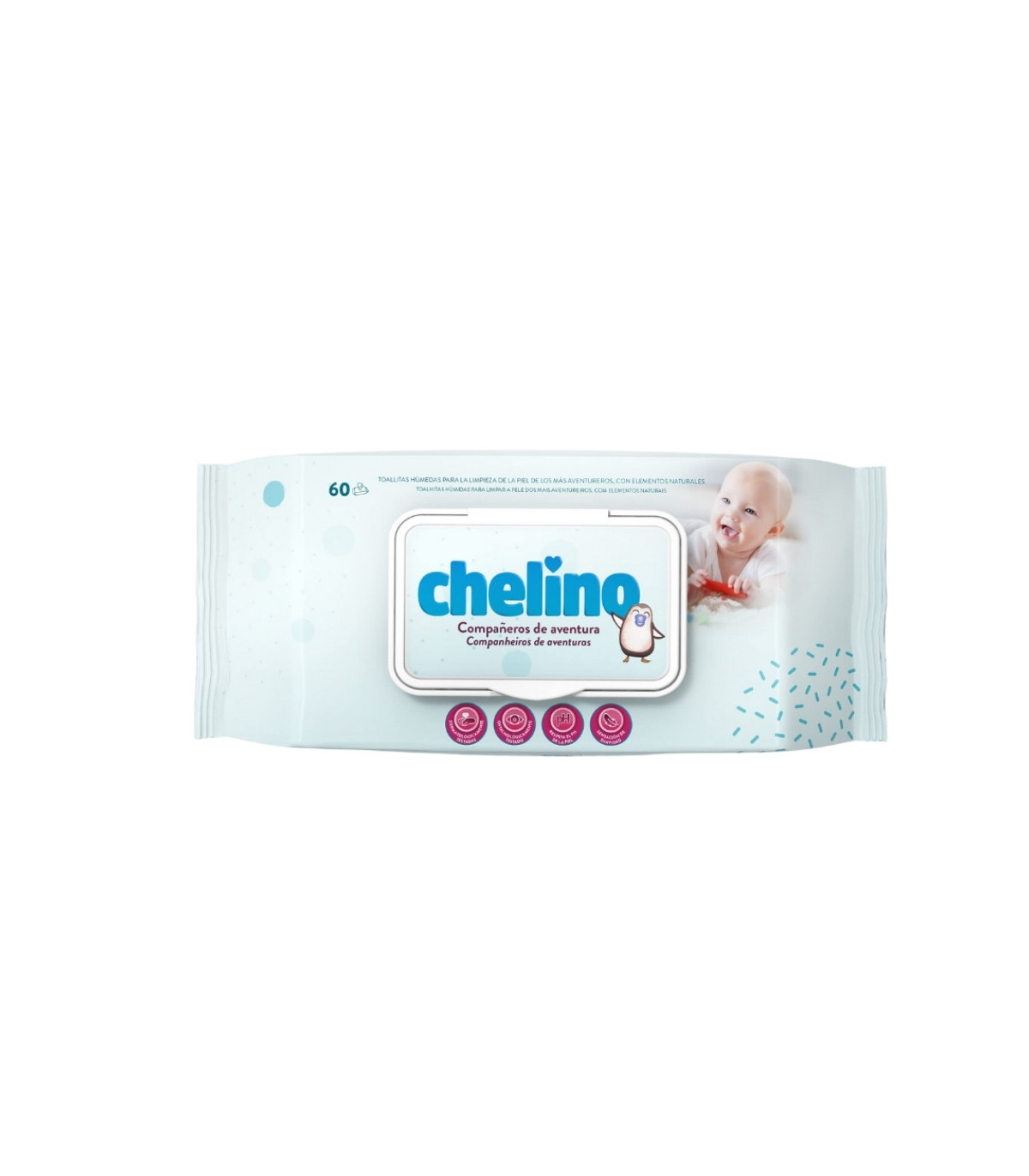 Chelino Toallitas Infantiles limpian e hidratan la piel del bebé con suavidad. Con aloe vera y camomila. Formato práctico de 60 unidades.