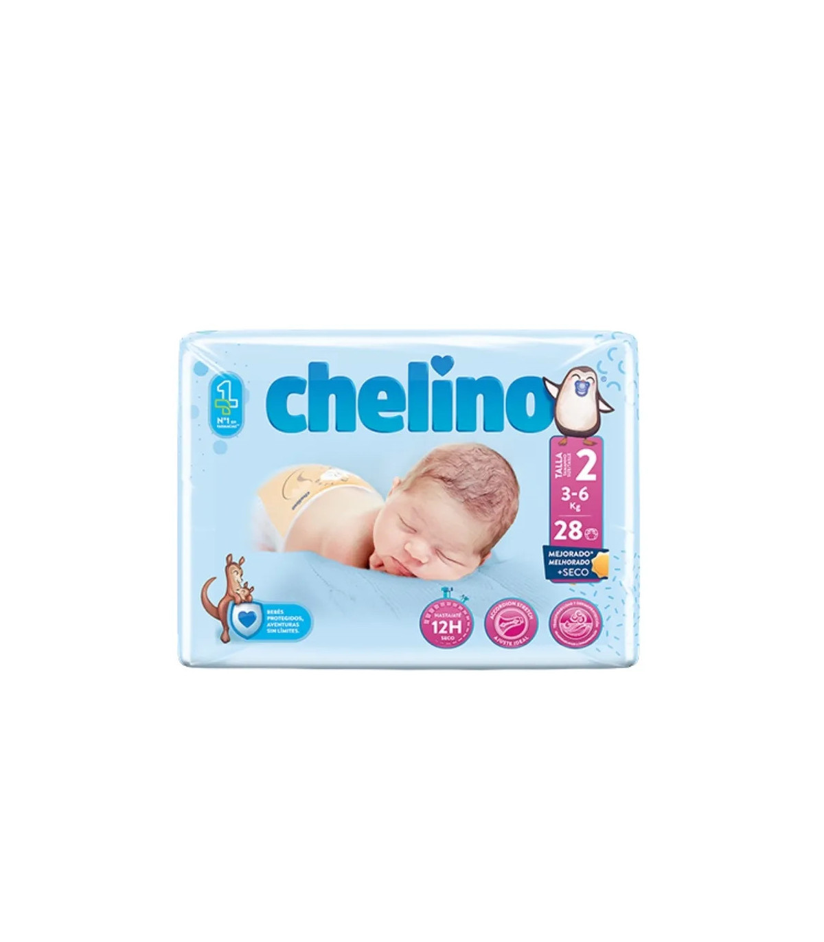 Pañales Chelino Talla 2 Recién Nacido, 28 unidades. Máxima absorción y suavidad para bebés de 3 a 6 kg. Diseñados para proteger la piel delicada desde el nacimiento.