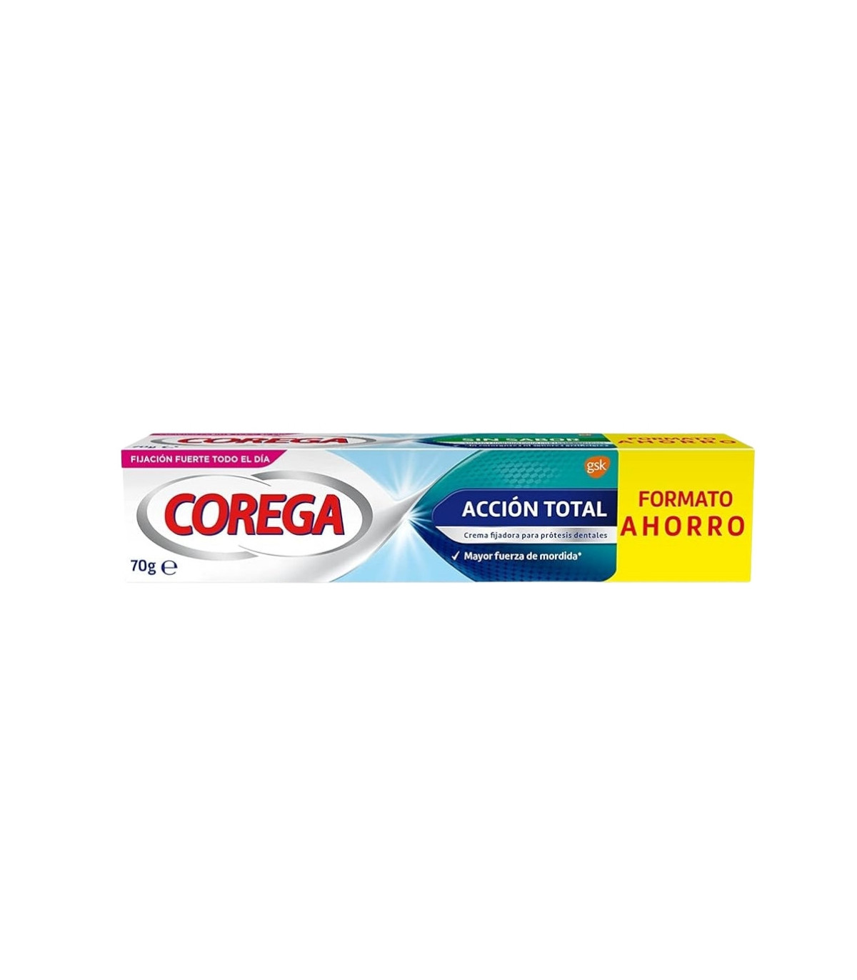 Corega Acción Total 70 g es una crema fijadora avanzada que proporciona hasta 12 beneficios en un solo producto, diseñada para usuarios de prótesis dentales completas o parciales. Garantiza una fijación fuerte y duradera, mejorando la seguridad al comer, hablar o sonreír.