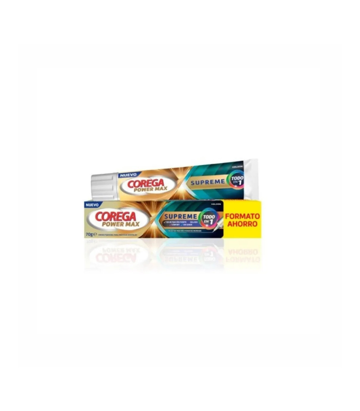 Corega Supreme Power Max 70 g es la crema fijadora más potente de la gama Corega, desarrollada para ofrecer una fijación extrema, un sellado total contra filtraciones y una comodidad prolongada durante todo el día. Ideal para quienes buscan máxima seguridad en el uso de prótesis dentales, incluso en situaciones de mayor actividad o uso prolongado.