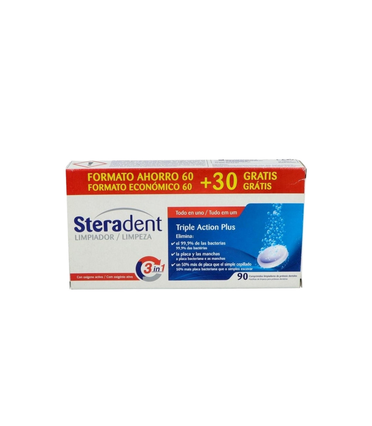 Steradent Pack 3x2 (60 + 30 comprimidos) limpia y desinfecta prótesis dentales, eliminando bacterias, manchas y olores. Eficaz y suave con el material.