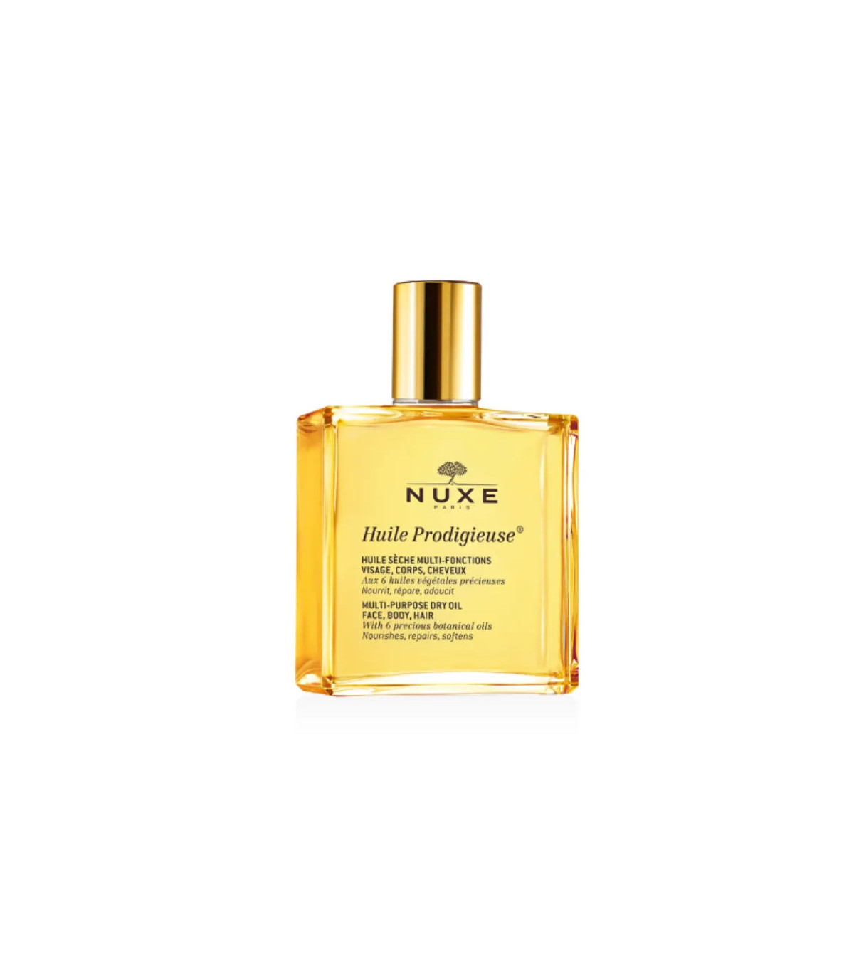 NUXE Huile Prodigieuse 50 ml es un aceite seco emblemático multiuso, diseñado para nutrir, hidratar y reparar la piel y el cabello. Su fórmula rica en aceites vegetales naturales, como el aceite de macadamia, avellana y borraja, aporta una nutrición profunda sin dejar sensación grasa.
