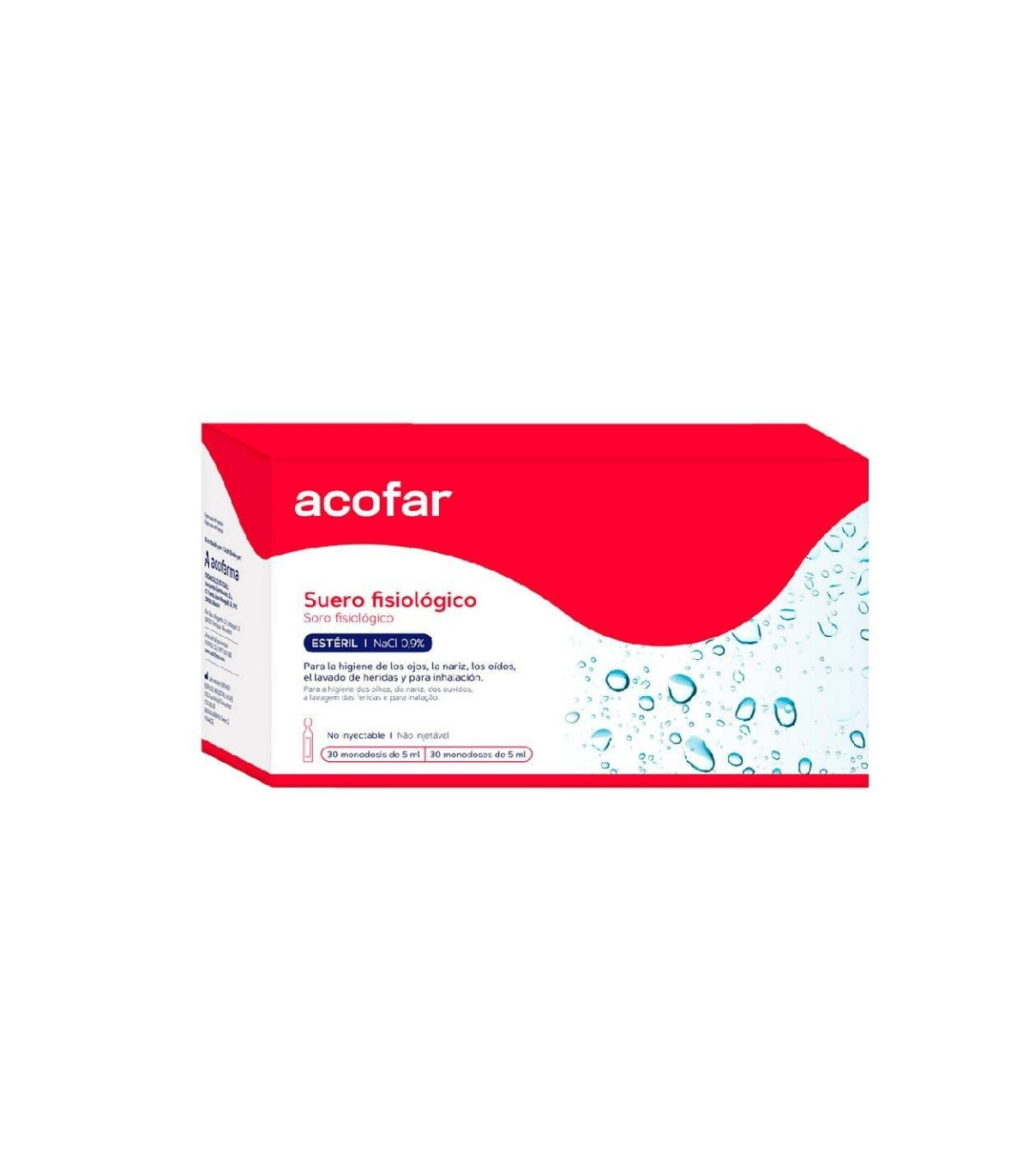 Acofar Suero Fisiológico Nasal y Oftálmico Estéril es una solución salina isotónica estéril, especialmente indicada para la higiene y cuidado diario de la nariz y los ojos. Su presentación en cómodas monodosis garantiza una aplicación segura, higiénica y sin conservantes, siendo apto para bebés, niños y adultos.