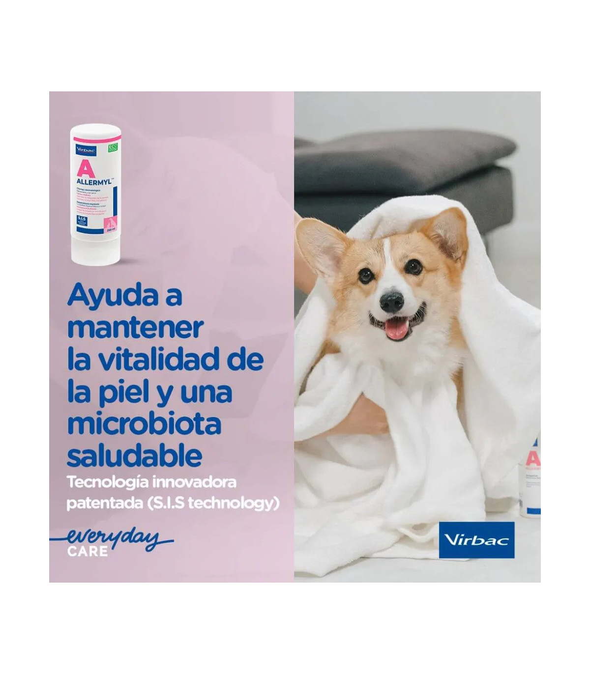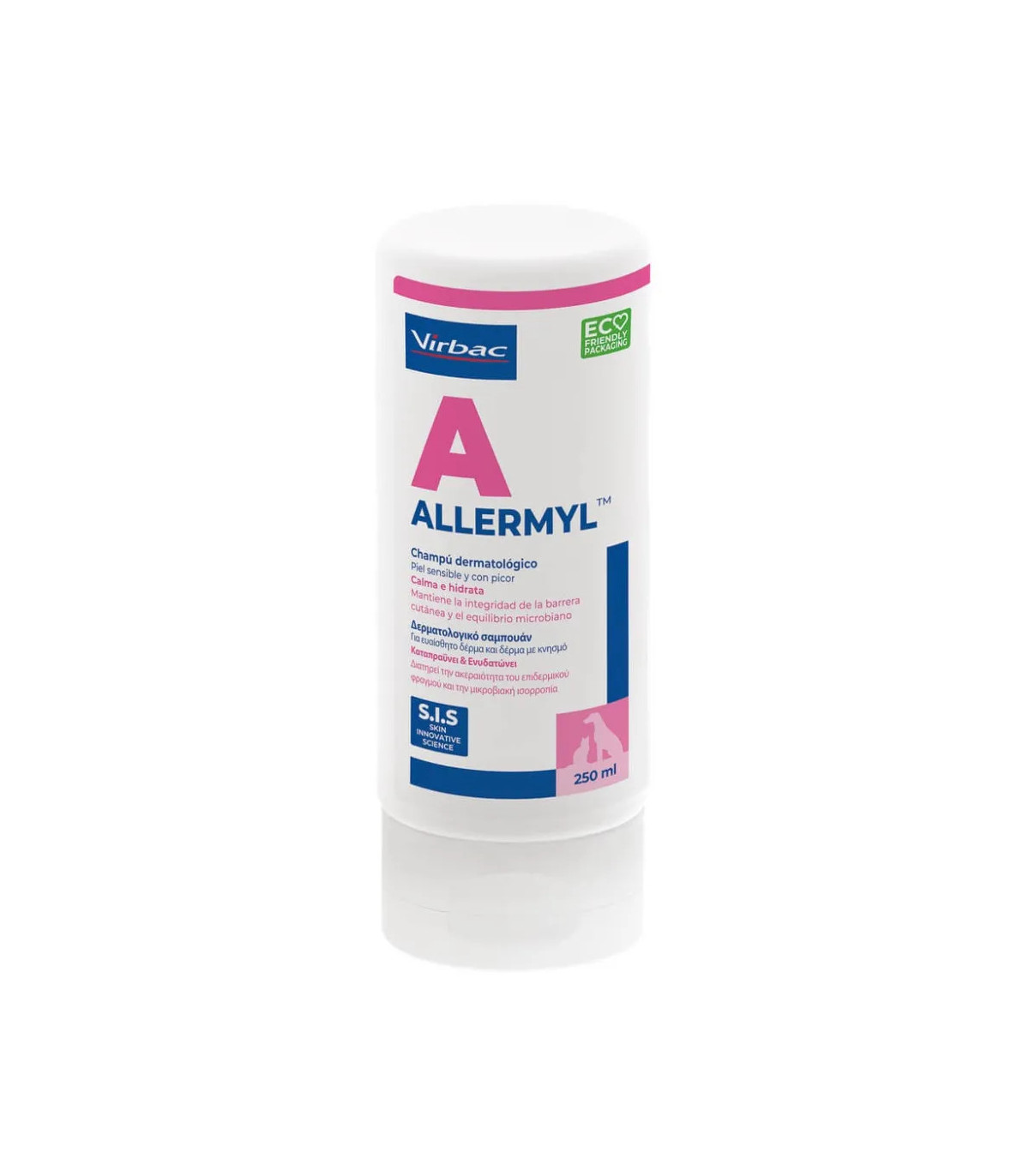 Champú dermatológico Allermyl 250 ml, formulado para perros y gatos con piel sensible, alérgica o con picazón. Acción calmante, hidratante y protectora