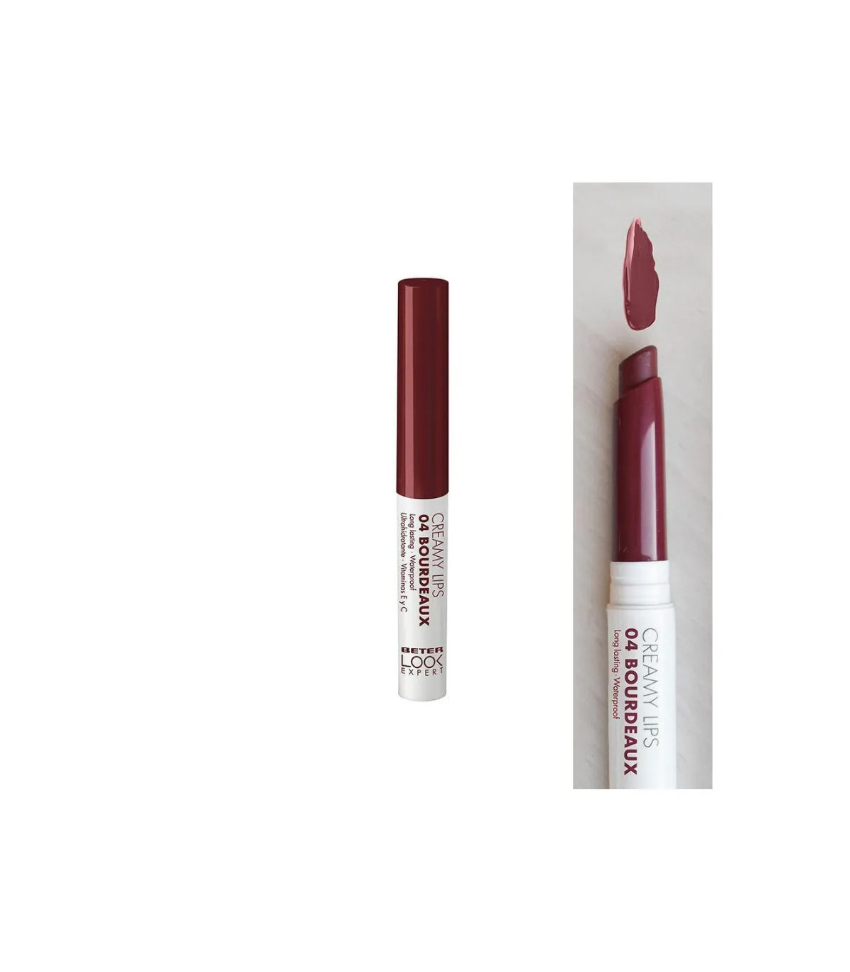 Labial cremoso Beter 04 Bordeaux con color profundo y fórmula hidratante que proporciona un acabado brillante y labios cómodos.