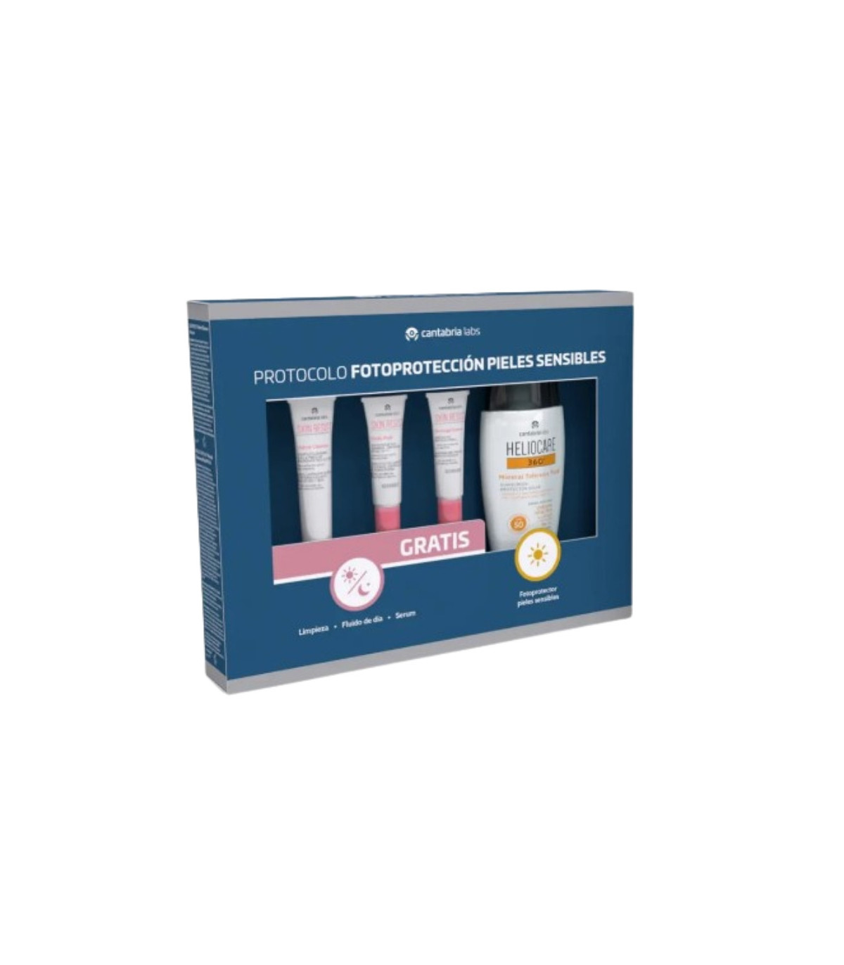 El Heliocare 360° Protocolo Fotoprotección Pieles Sensibles combina limpieza, tratamiento, hidratación y protección solar con filtros 100 % minerales. Diseñado para pieles sensibles, reactivas o con tendencia a rojeces, calma, refuerza la barrera cutánea y protege frente a radiación UV, luz visible e infrarrojos.