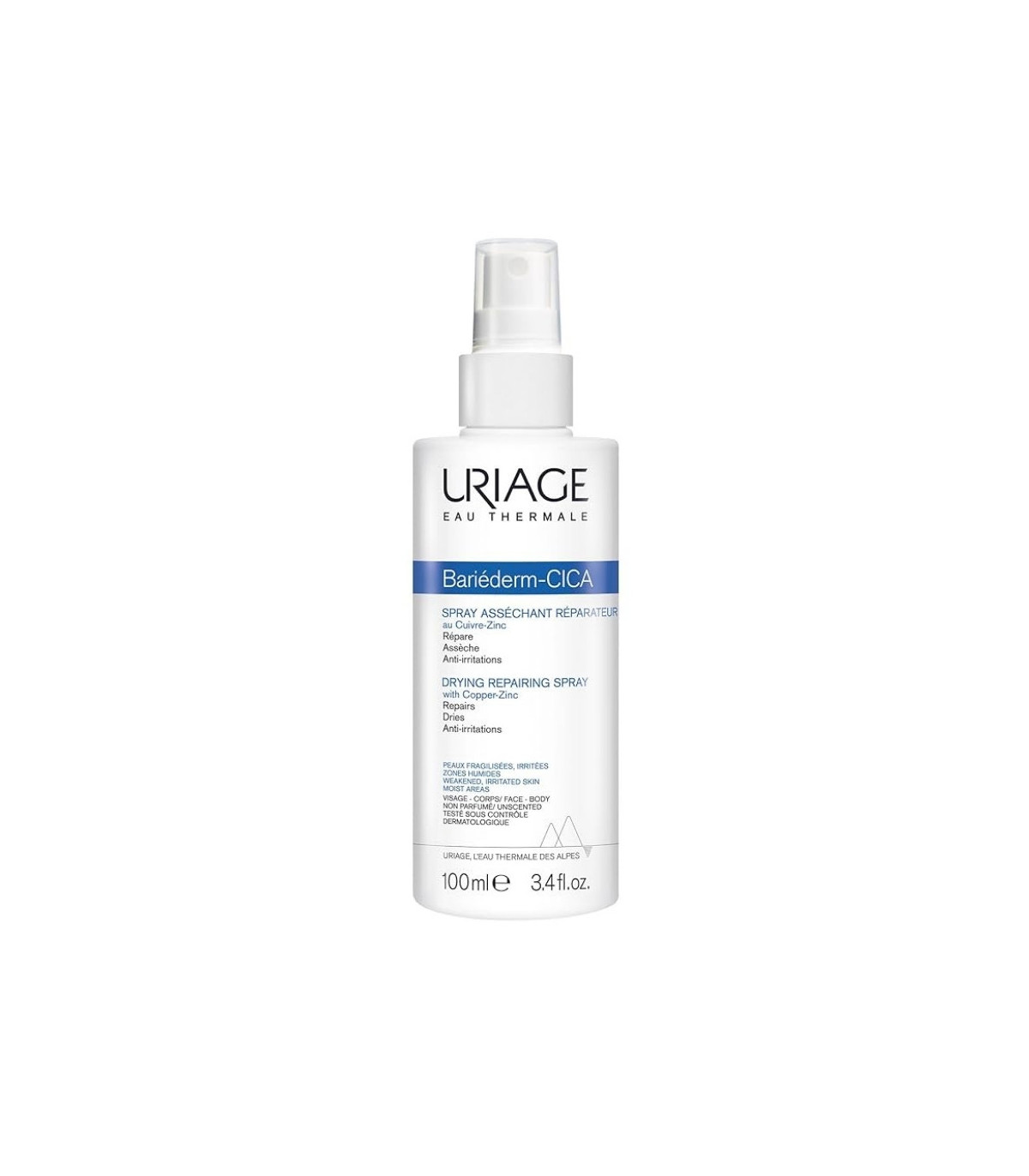 Bariéderm Cica Spray 100 ml de Uriage es un tratamiento específico para pieles irritadas, maceradas o húmedas, ideal en zonas donde no es conveniente aplicar cremas. Su fórmula en spray secante permite una aplicación fácil, sin contacto directo, respetando la piel alterada o dolorida.