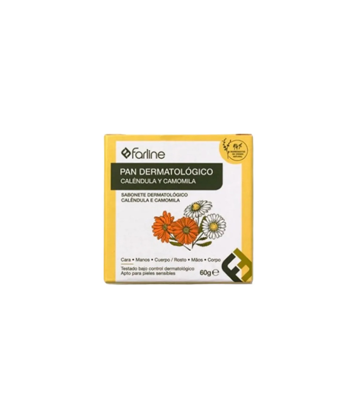 Farline Pan Dermat Cal/Cam 60 g es un jabón dermatológico formulado con extractos de caléndula y camomila, ideal para limpiar y calmar la piel sensible o irritada.