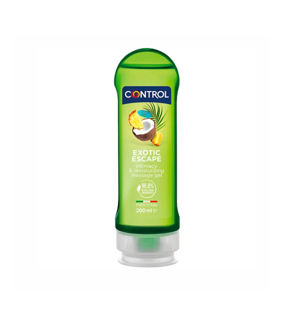 Control Exotic Escape Gel de Masaje 200 ml es un gel íntimo y corporal con efecto 3 en 1: hidratante, lubricante y estimulante sensorial. Formulado con un 98 % de ingredientes de origen natural, es apto para masajes corporales y zonas íntimas.