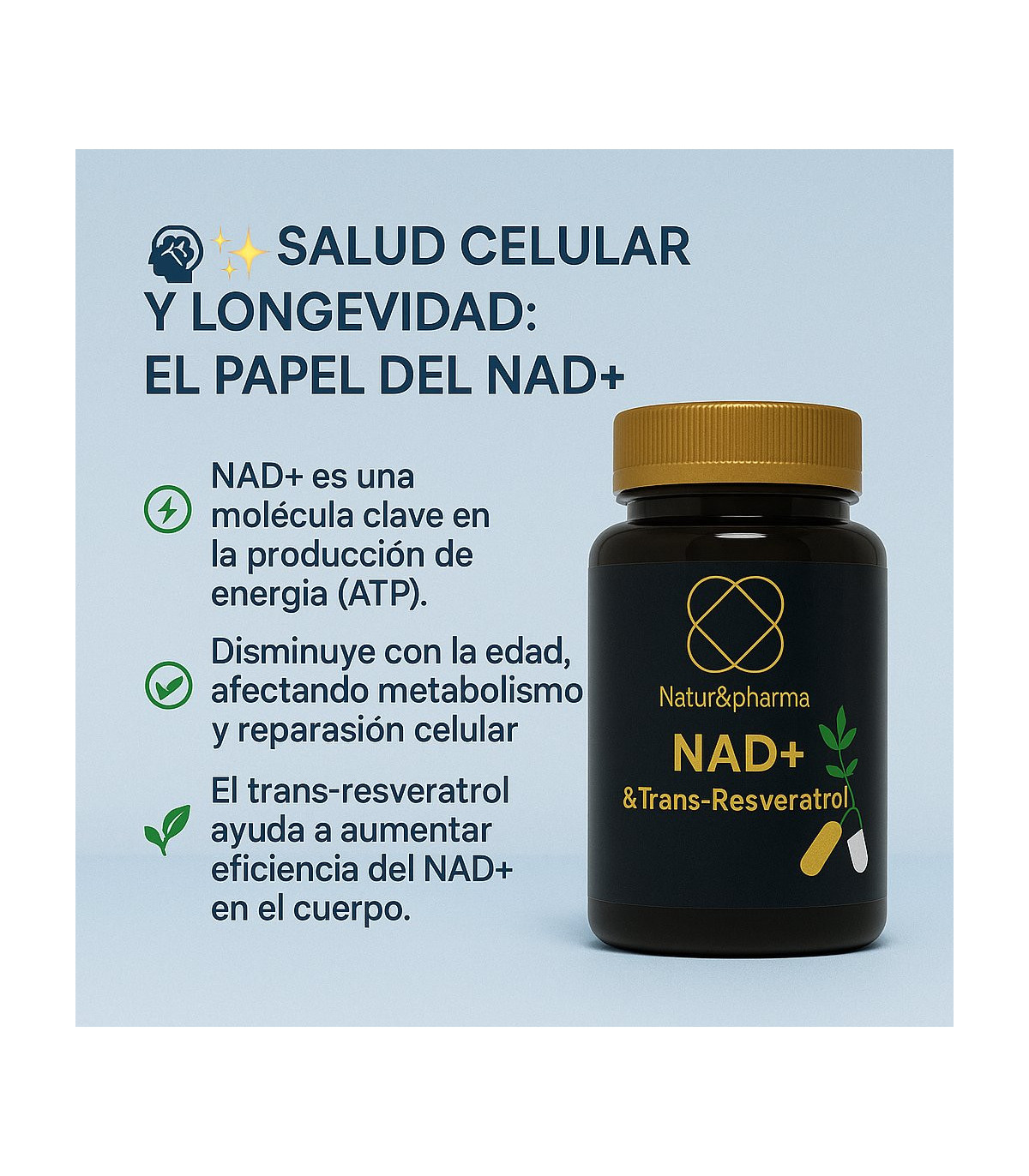 Suplemento antiedad con 60 cápsulas que combina 50 mg de NAD+ (nicotinamida adenina dinucleótido) y 200 mg de trans-resveratrol de alta pureza por cápsula, para impulsar la producción de energía celular, favorecer la reparación del ADN y aportar un potente efecto antioxidante.
