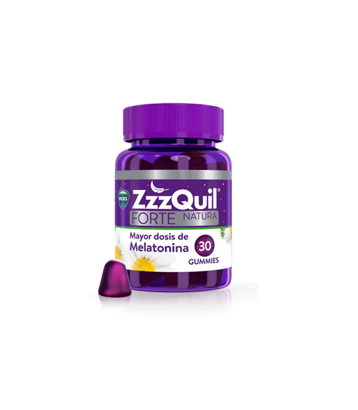 ZzzQuil Melatonina Forte 30 Gummies es un suplemento en gomitas que facilita el descanso nocturno, reduciendo el tiempo para dormir y mejorando la calidad del sueño.