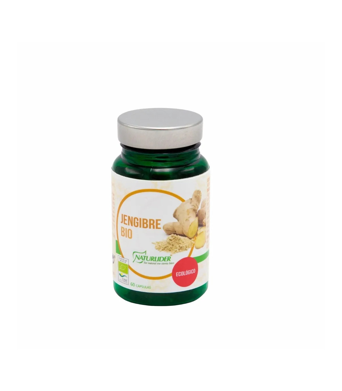 Suplemento con 60 cápsulas vegetales de jengibre orgánico (Zingiber officinale) estandarizado en raíz pura, que apoya la digestión, alivia náuseas y refuerza las defensas gracias a su acción antioxidante y antiinflamatoria natural.