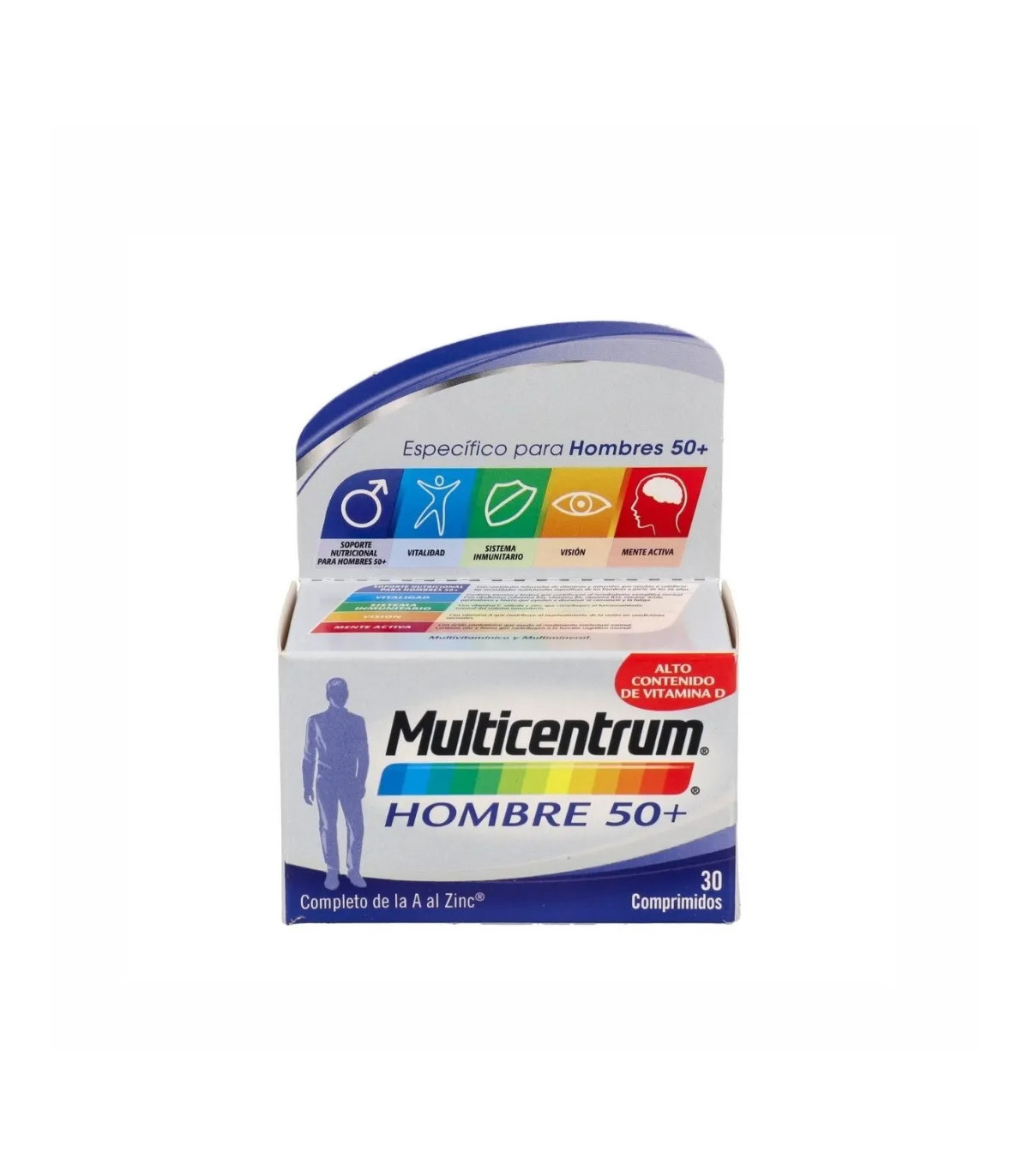 Multicentrum Hombre 50+ 30 comprimidos es un complemento alimenticio formulado específicamente para cubrir las necesidades nutricionales de los hombres a partir de los 50 años. Su combinación de vitaminas y minerales ayuda a mantener la energía, la vitalidad, las defensas y la salud muscular y ósea.